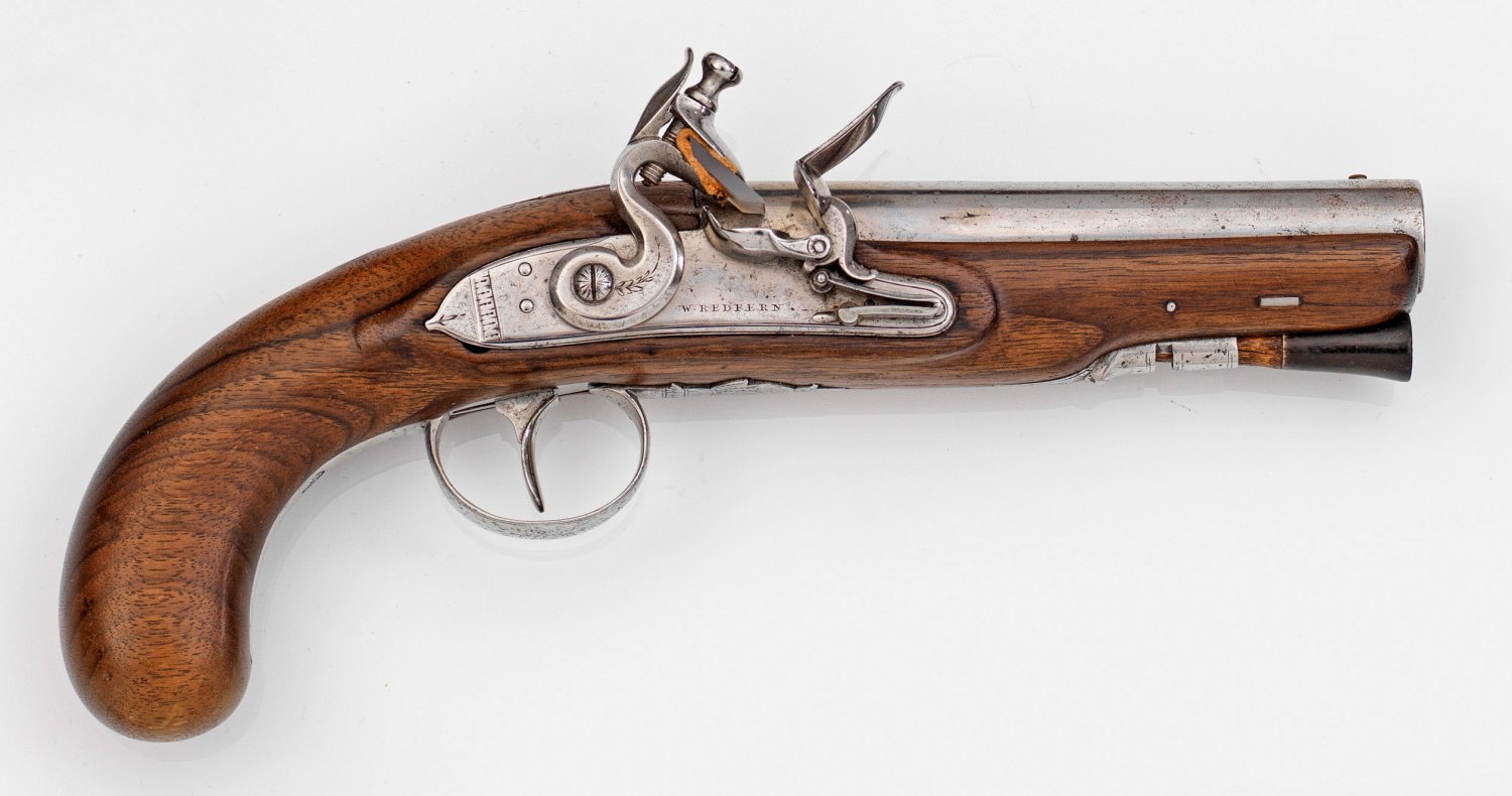 Steinschloss-Pistole Nussbaumvollschäftung. Runder Lauf. Eisernes Steinschloss mit Signatur W. Redfern auf Schlossplatte. Garnitur aus Eisen. Mit dezentem Blatt- und Blütendekor. Rollengelagert auf Feder. Dickes Kaliber. Auf silberner Daumenplakette Gravur. Lauf mit undeutl. Marken. Ladestock mit Horndopper. L. 36 cm.