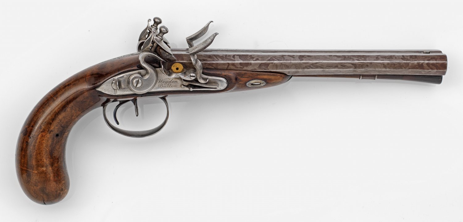 Doppelläufige Steinschlosspistole Nussbaumhalbschäftung. Nebeneinander liegende achtkantige, brünierte Damastläufe mit gravierter Signatur "Wogdon & Barton London". Steinschlösser und Garnitur aus Eisen. Zündlöcher aus Gold. Schraubenschwanzplatte mit strahlenförmigem Dekor, Rocaillen und Blättern. Schloss- und Gegenplatte sign.; Zwei Abzüge und Sicherung. Rollengelagerte Batterie. Auf Abzugbügel graviertes Trophäenbündel, u.a. mit Speeren. Hölzerner Ladestock mit Horndopper. L 45 cm.