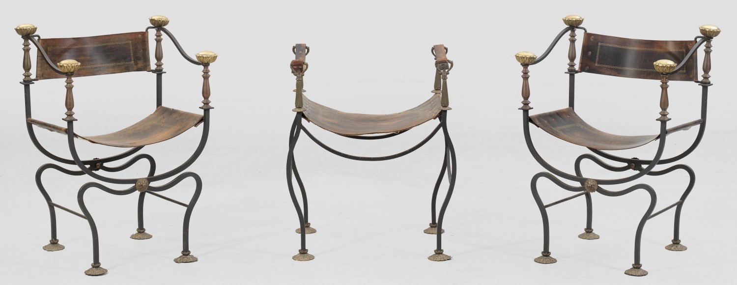 Außergewöhnliche Stuhlgruppe 3-tlg.; Paar Armlehnstühle und Hocker. Geschwärztes Eisen und Messing. Gondelförmiges Gestell aus stark geschwungenen und teilw. gegeneinander gestellten Streben, durch Rosettenmotive verbunden. Gegliederter Balusterschaft als Stütze für schmale Armlehnen mit großen, blütenförmigen Abschlüssen. Sitzfläche und Lehnen aus braun patiniertem, ornamentiertem Leder, teilw. besch. und rep.; Sitz-H. 42 cm.