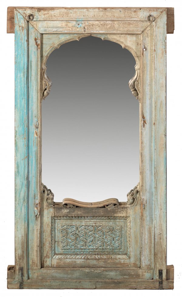 Großer Wandspiegel aus einem indischen Architekturelement Holz, geschnitzt sowie teilw. hellblau gefasst. Gerade, hochrechteckige Spiegelrahmung mit passig geschweifter, nischenförmiger Aussparung über Spiegelfläche. Unterhalb kassettierte Reserve mit Rautenmotiven. 184 cm x 110 cm.