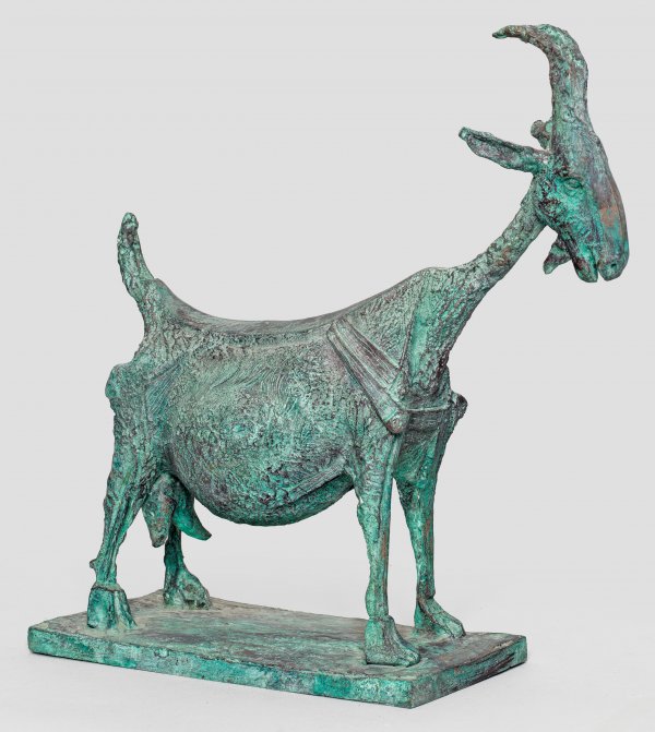 Bronze, hellgrün patiniert. Posthumer, zeitgenössischer Guss (Ende 20./Anfang 21. Jh.) nach der 1950 von Picasso assemblageartig aus unterschiedlichen Materialien im Töpferort Vallauris geschaffenen Ziegenskulptur (heute im Musée Picasso in Paris). Erste Bronzegüsse der Ziege wurden Anfang der 1950er Jahre ausgeführt (u. a. im Museum of Modern Art in New York, Guss von 1952). H. 47,2 cm; B. ca. 44 cm.