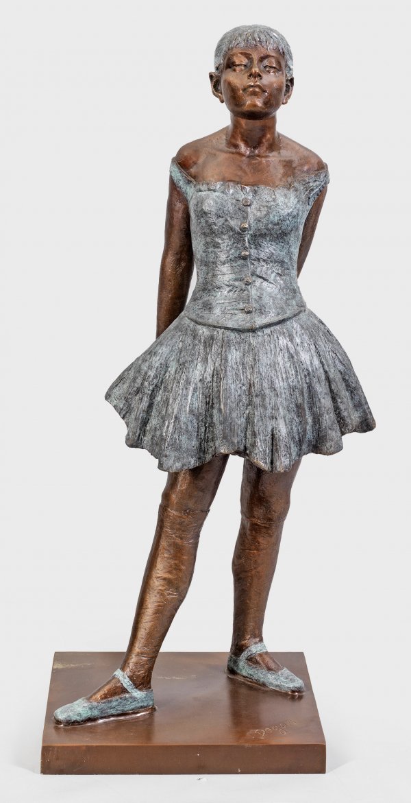 Bronze, dunkelbraun und graugrün patiniert. Künstler-Bez.; Posthumer, zeitgenössischer Guss, Ende 20./Anfang 21. Jh.; Auf einer rechteckigen Plinthe stehende junge Ballerina, ihre Hände hinter dem Rücken faltend. Die "Kleine Tänzerin" ist die einzige Plastik, die Degas zu Lebzeiten zeigte - 1881 auf der Impressionisten-Ausstellung. Frühe Güsse von 1922 befinden sich im Musée d'Orsay in Paris und Metropolitan Museum in New York. H. 120 cm.