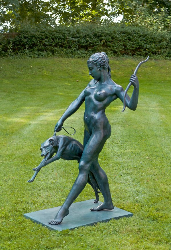 Bronze, dunkelgraugrün patiniert. Künstler-Bez.; Auf einer rechteckigen Plinthe schreitende Aktfigur der Jagdgöttin mit Bogen, mit ihrer rechten Hand einen Windhund an einer Leine zügelnd. Posthumer, zeitgenössischer Guss (Ende 20./Anfang 21. Jh.) der 1923 geschaffenen, bekannten Bronzeplastik, von der sich Versionen u. a. im Metropolitan Museum of Art in New York befinden. McCartan studierte bis zu seiner Rückkehr in die USA 1910 in New York und in Paris an der École des Beaux-Arts. Er spezialisierte sich auf klassisch idealisierende Skulpturen, die ihn in den USA weithin bekannt machten. H. 157 cm. Plinthe 80 cm x 60 cm.
