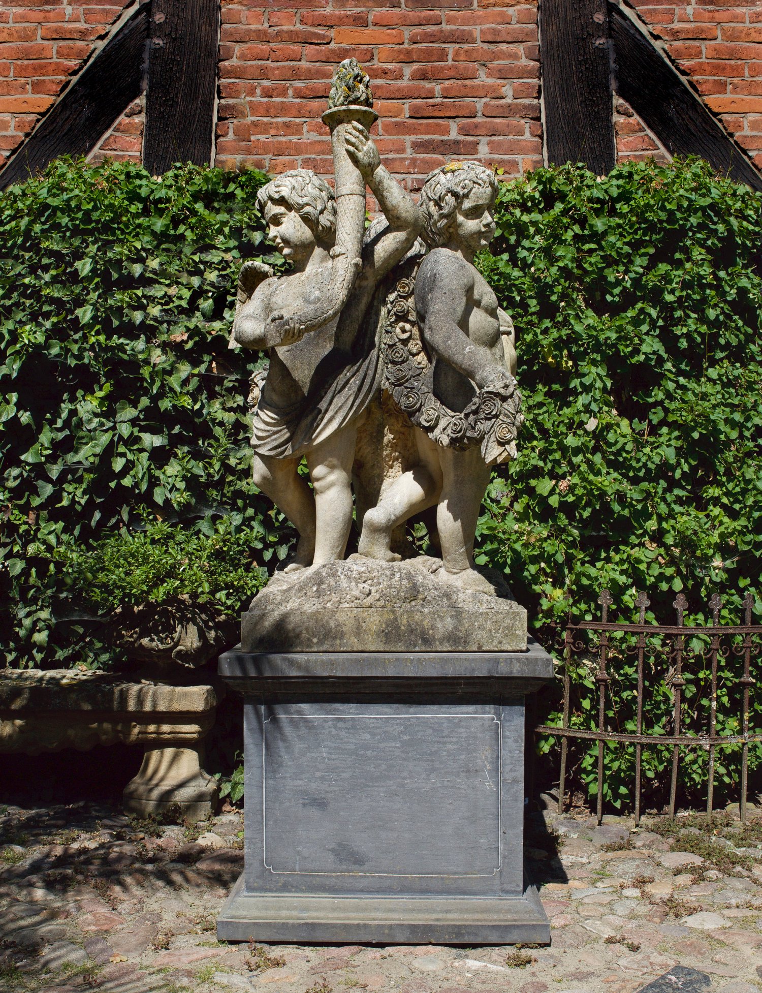 Weißer Carrara-Marmor. Fein ausgeführte, allansichtige Gruppe in der Tradition barocker Skulpturen. Auf einer quadratischen Plinthe zwei vollplastische, mit dem Rücken zueinander stehende Putten mit einer Rosengirlande und ein Engel mit Füllhorn, Liebe und Glück symbolisierend. Quadratischer Postamentsockel aus hellgrauem Stein mit vorkragender Basis und korrespondierender Deckplatte, die Seiten mit konturierten Rahmungen. Skulpturen-H. 150 cm; Sockel-H. 69,5 cm. Ges.-H. 219,5 cm.