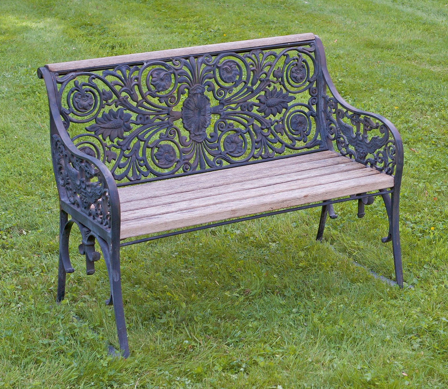 Gusseisen, schwarz lackiert sowie Holz. Durchbrochen gearbeitete, schmale Seitenwangen aus stilisierten Adlermotiven und Blattwerk, in leicht zurück schwingende Rückenlehne aus zentraler Blütenrosette und üppigen, eingerollten Blattvoluten übergehend. Sitzfläche und Lehnenabschluss aus gekanteten Stegen. Rep.; H. 83 cm. 107 cm x 58 cm. Sitz-H. 42 cm.