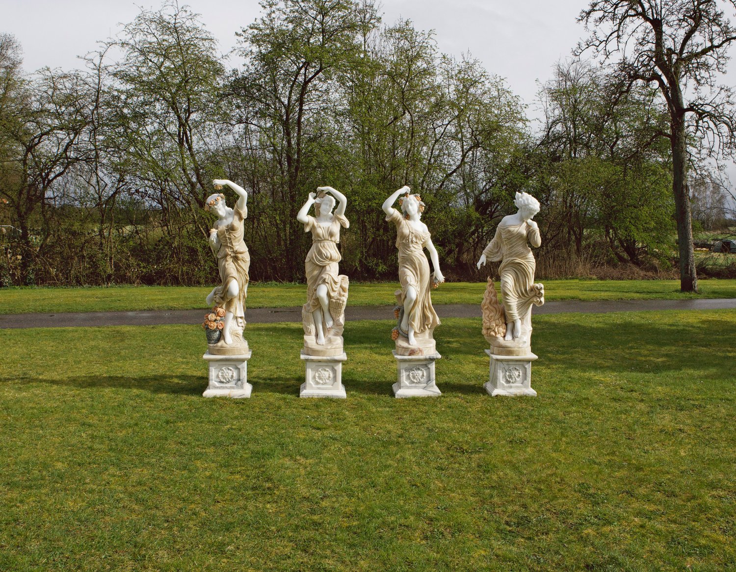 Weißer Carrara-Marmor und hellgrau geäderter Marmor sowie farbiger Onyx. Auf runden Plinthen im Kontrapost stehende Mädchen bzw. junge Damen in weich-fließenden Kleidern, die Füße und Beine durch bewegte Posen teilw. freilassend. Vollplastische, allegorische Skulpturen in der Tradition des Barock und Rokoko mit ihren jeweiligen Attributen als Personifikationen der vier Jahreszeiten: Rosen als Symbol des Frühlings, Ährenbündel für den Sommer, Weintrauben für den Herbst und ein loderndes, wärmendem Feuer für den Winter. Der große dekorative Reiz der subtil gestalteten Skulpturen geht besonders von der Kombination der verschiedenen farbigen Steinsorten aus, die geschickt miteinander kombiniert wurden. Quadratische Postamentsockel mit vorkragender Basis und korrespondierender Deckplatte, auf Vorder- und Rückseite gerahmte Felder mit reliefierten Rosetten. H. ca. 163 cm - 168 cm. Ges.-H. ca. 205 cm - 210 cm.