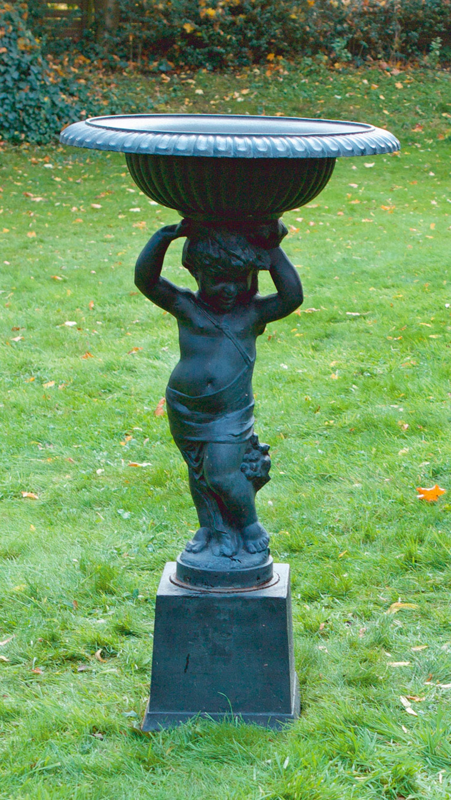 Belle Epoque-Gartenbrunnen Gusseisen, schwarz lackiert. Vollplastische Darstellung eines Puttenknaben als Träger für umlaufend godronierte Brunnenschale mit weit ausschwingendem Lippenrand aus breitem Zungenfries. Unterhalb quadratischer, leicht konischer Sockel. H. 127 cm.