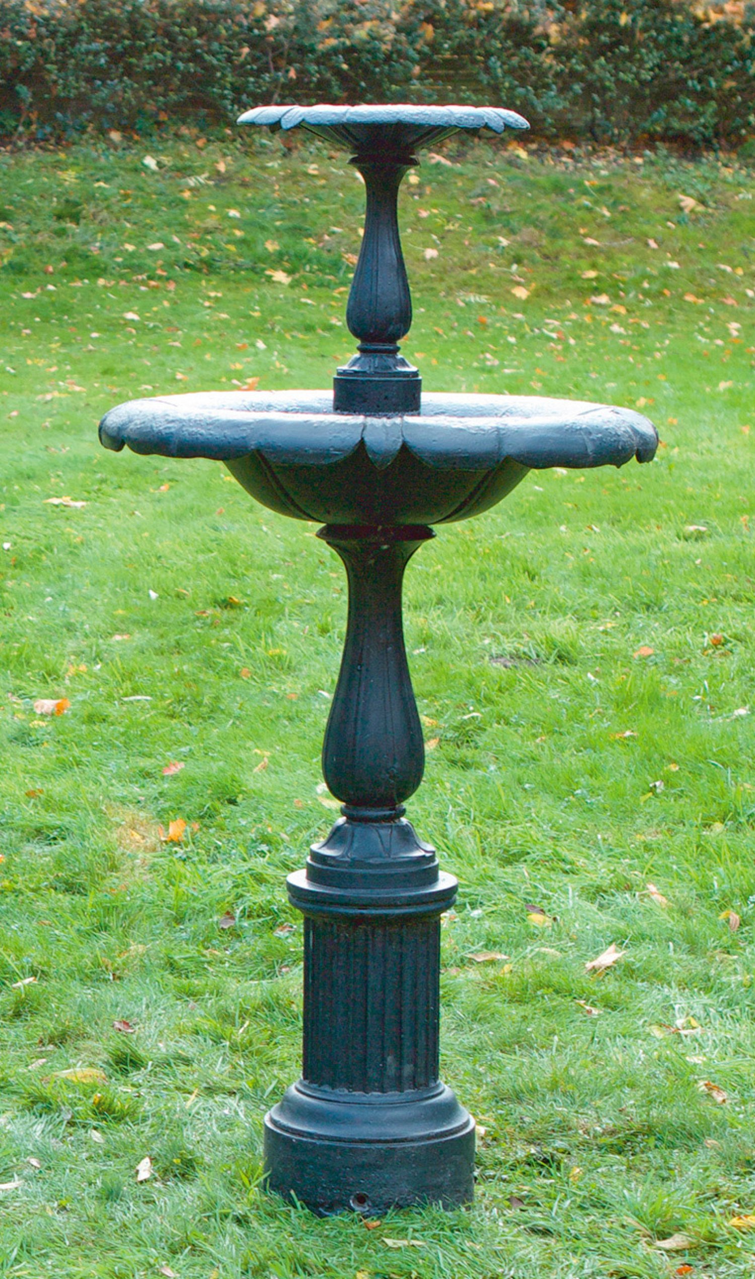 Viktorianischer Gartenbrunnen Gusseisen, schwarz lackiert. Mehrfach gegliederter Balusterschaft mit breiten, reliefierten Zungenmotiven als Träger für flache, weit ausschwingende und gestaffelt angeordnete Brunnenschalen. Unterhalb kannelierter Säulenschaft. H. 142 cm.