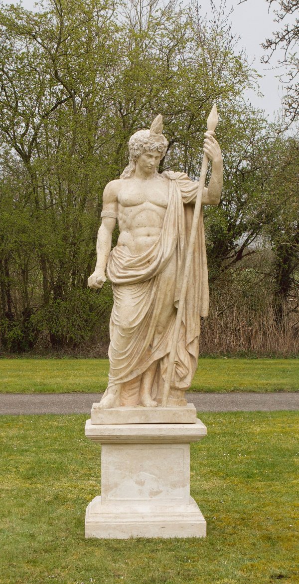 Travertin. Vollplastische, überlebensgroße Darstellung. Geschildert wird wahrscheinlich der griechische Gott Ares, auf einer rechteckigen Plinthe stehend als junger Krieger mit einem Speer in der linken Hand und einem an der Schulter mit einer Brosche gehaltenem, weit herunterfallendem Umhang. Die subtil ausgeführte Statue mit ihrem muskulös definierten Körper ist durch antike Vorbilder wie der berühmten Marmorskulptur des Ares Borghese inspiriert, der 1807 von Napoleon erworben wurde und sich seitdem im Louvre befindet. Rechteckiger Sockel mit vorkragender Fuß- und Deckplatte. H. ca. 210 cm; Sockel-H. 72,5 cm; Ges.-H. ca. 282,5 cm.