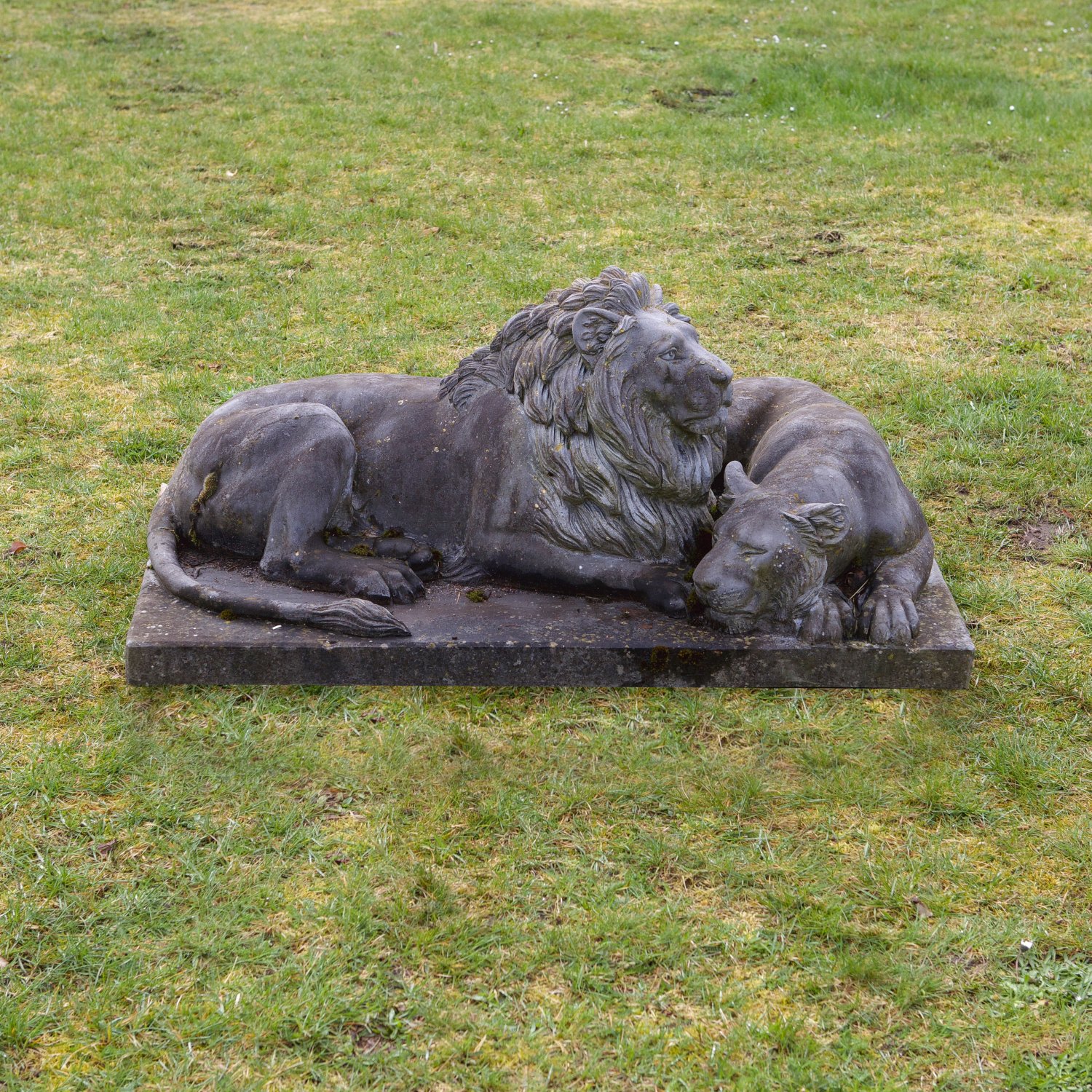 Blaugrauer belgischer Kalkstein, sog. Belgisch Granit. Vollplastische Gruppe. Auf einer rechteckigen Plinthe liegende, schlafende Löwin und ein ruhender, wachsamer Mähnenlöwe. Realistische, lebendig geschilderte Tierskulptur in der Tradition des 19. Jhs., insbesondere der französischen Bildhauer aus der Gruppe der Animaliers. Ca. 48,5 cm x 115 cm x 77,5 cm.