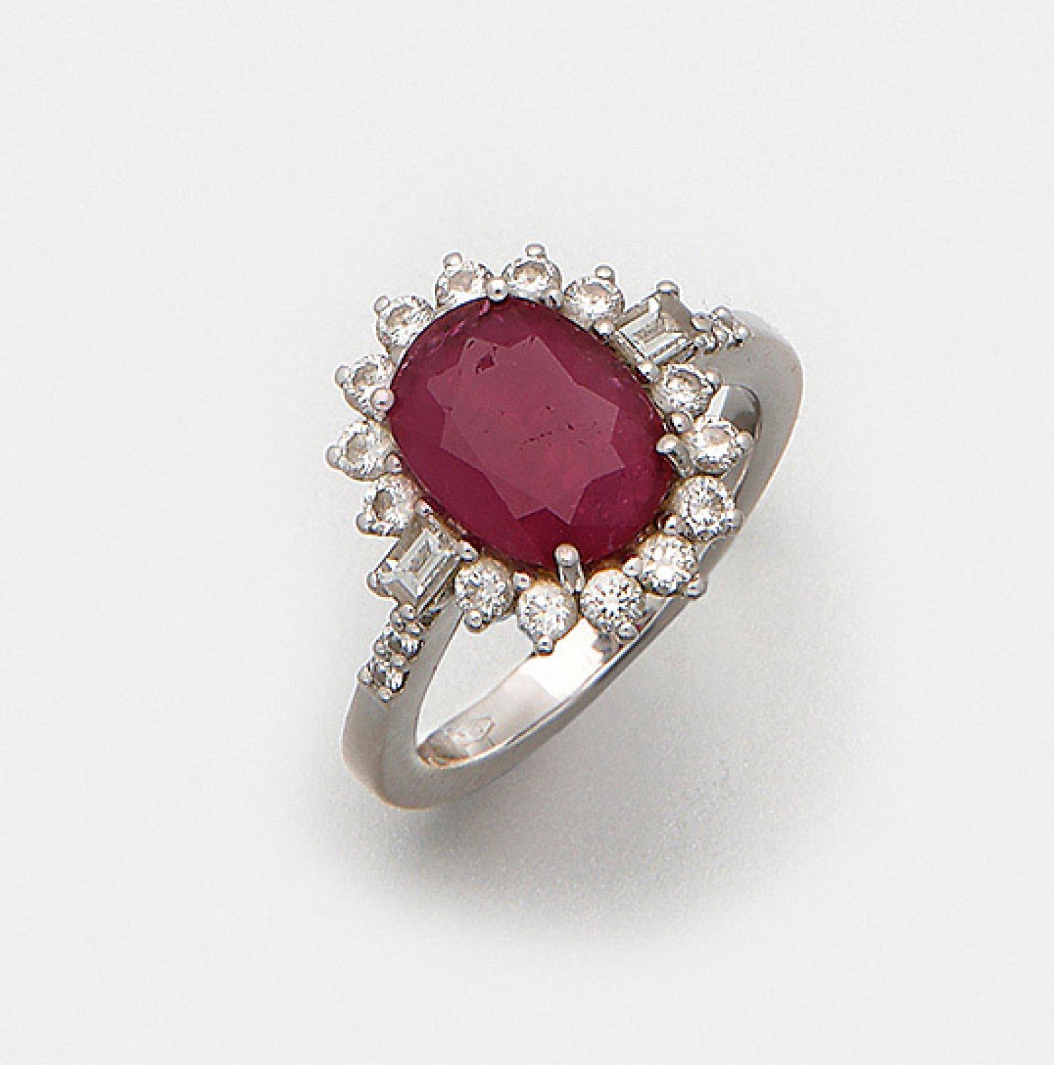Klassischer Burma-Rubinring mit Brillanten Weißgold, gest. 750. Zentral besetzt mit einem unbehandelten taubenblutroten Rubin von ca. 3,52 ct., entouriert von Brillanten und Diamantbaguetten von zus. ca. 0,60 ct. (H-J/vs-si). Gew. ca. 6,92 g.