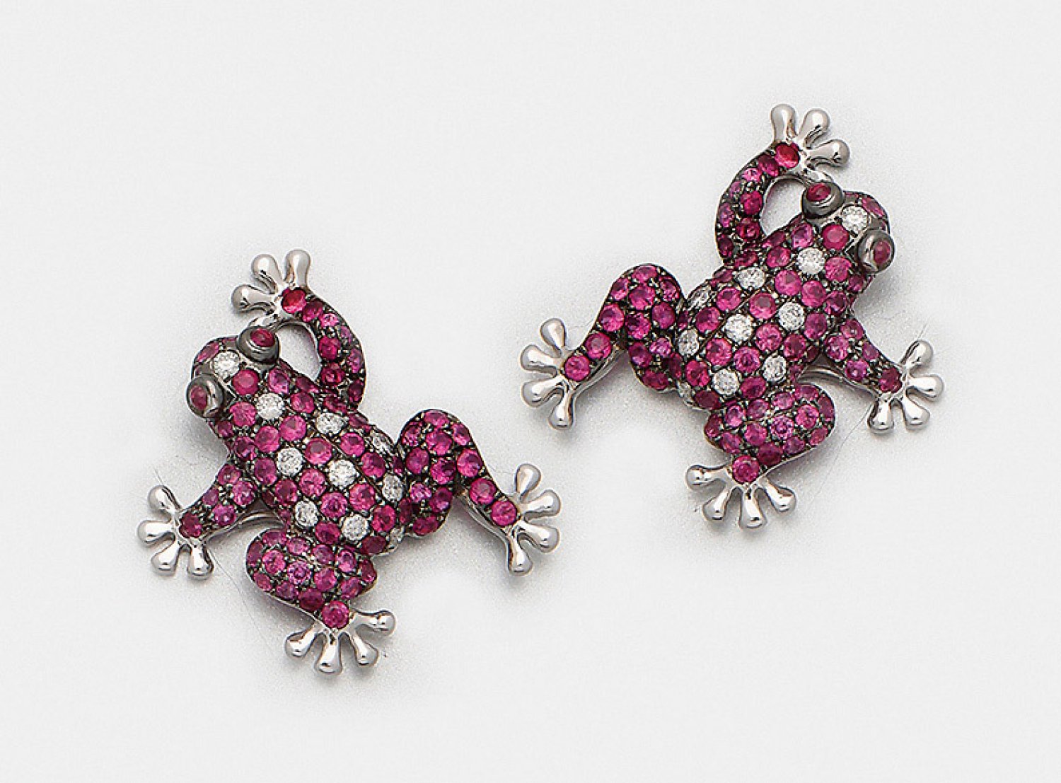 Paar extravagante Frosch-Ohrringe mit Rubinen Weißgold, gest. 750. Schauseitig besetzt mit Rubinen von zus. ca. 2,06 ct. und Brillanten von zus. ca. 0,26 ct. (H/si). Ges.-Gew. ca. 7,30 g.