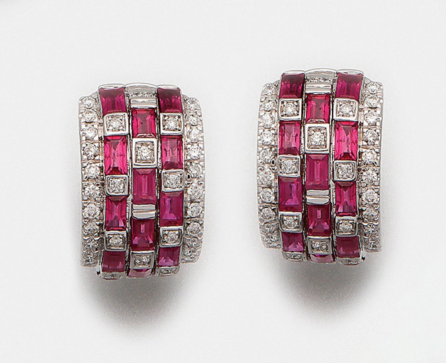 Paar elegante Rubin-Ohrclips Weißgold, 18 ct. Schauseitig besetzt mit taubenblutroten Rubinen von zus. ca. 4,00 ct. im Baguetteschliff, im dekorativen Wechsel mit Diamanten von zus. ca. 0,90 ct.; Ges.-Gew. ca. 17,06 g.