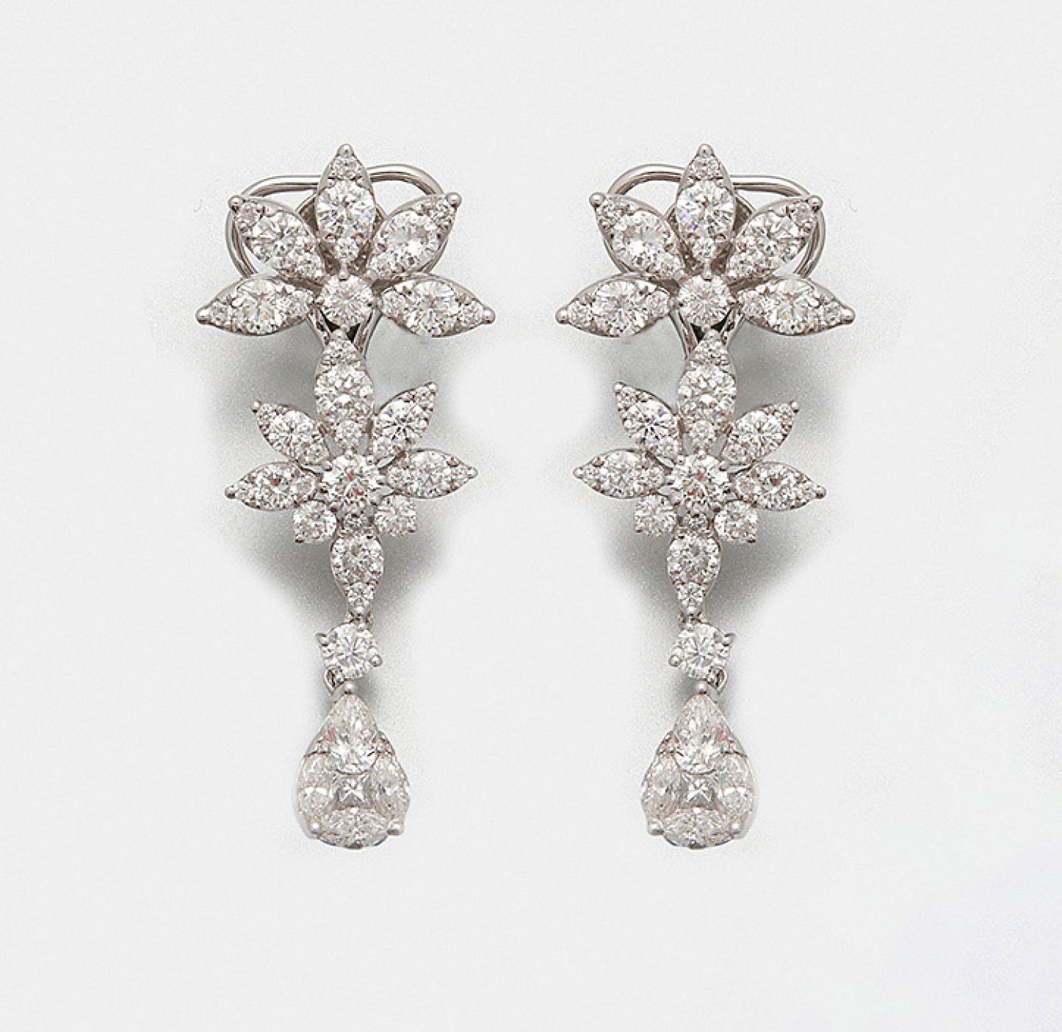 Paar glamouröse Diamant-Ohrgehänge Weißgold, gest. 750. Schauseitig besetzt mit Brillanten, Diamantnavetten und -tropfen von zus. ca. 4,76 ct. (F-G/vvs). Steckbrisuren auch separat tragbar. Ges.-Gew. ca. 10,10 g.