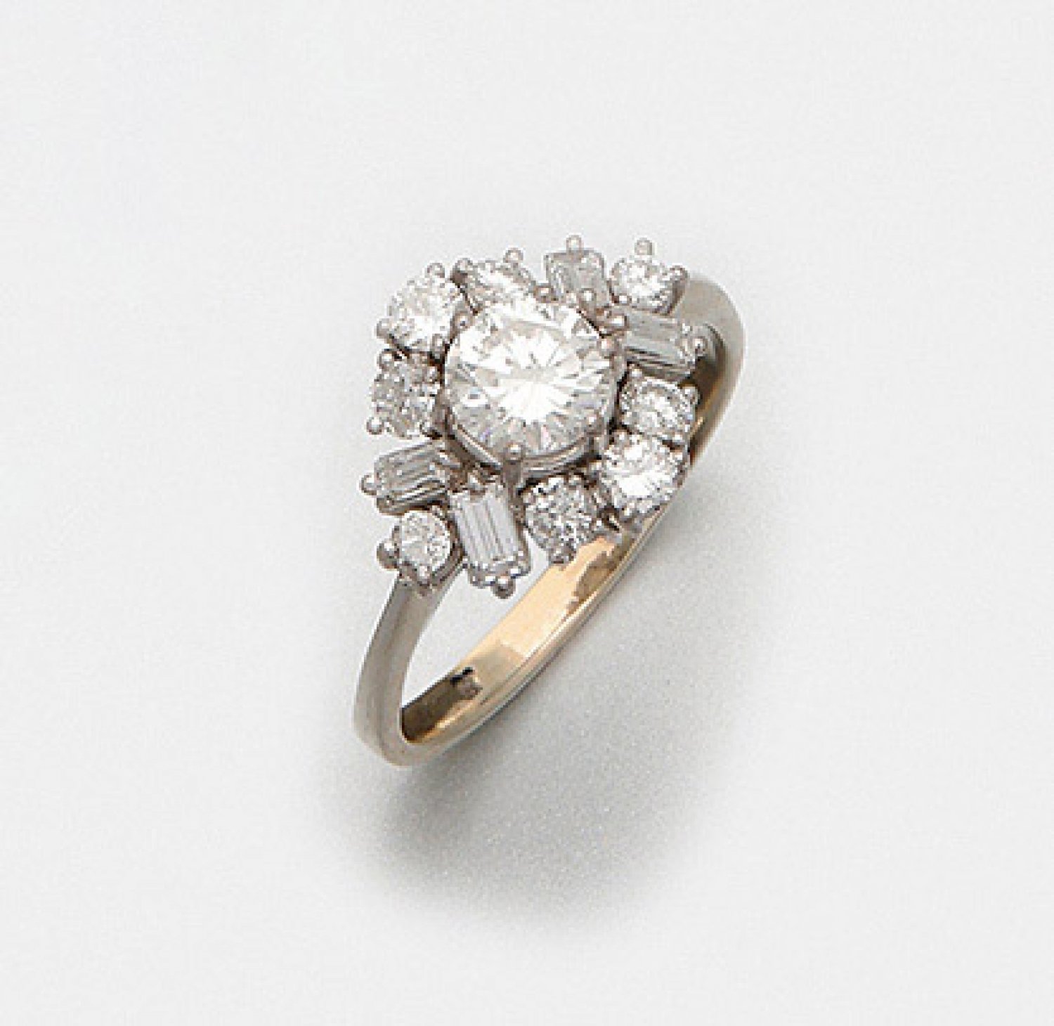 Hochfeiner Diamantring Weißgold, gest. 750. Zentral besetzt mit einem Brillanten von ca. 0,50 ct. (I-J/si) entouriert von Brillanten und Diamantnavetten von zus. ca. 0,40 ct. (H/vvs). Gew. ca. 3,07 g.