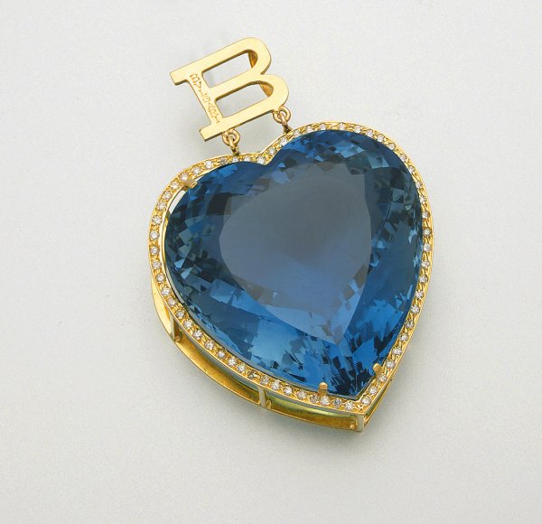 Spektakulärer großer Topas-Herzanhänger Gelbgold, gest. 750. Zentral besetzt mit einem Topas in der seltenen Farbe "London Azurblau" von ca. 380 ct. im aufwendigen Herzschliff, entouriert von kleinen Brillanten von zus. ca. 0,60 ct. (H/si). Gew. ca. 103,21 g.