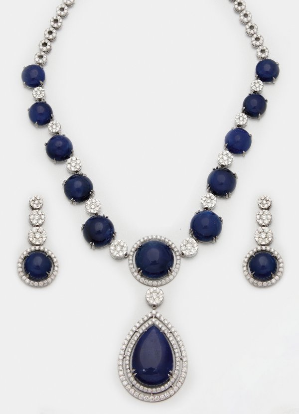 Glamouröses Saphir-Brillant-Parure Collier und korrespondierendes Paar Ohrgehänge. Weißgold, gest. 750. Schauseitig besetzt mit royalblauen Saphiren im Cabochonschliff von zus. ca. 190,36 ct. und Brillanten von zus. 14,84 ct. (I-J/vs). Ges.-Gew. ca. 90,39 g.