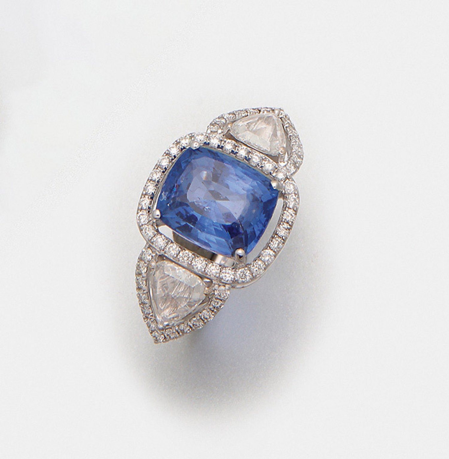Hochqualitätvoller Saphirring Weißgold, gest. 750. Zentral besetzt mit einem kornblumenblauen Saphir von ca. 6,75 ct. im Kissenschliff, flankiert von zwei Diamant-Trillianten und kleinen Diamanten von zus. ca. 1,26 ct. (I-J/si-pi). Gew. ca. 6,82 g.