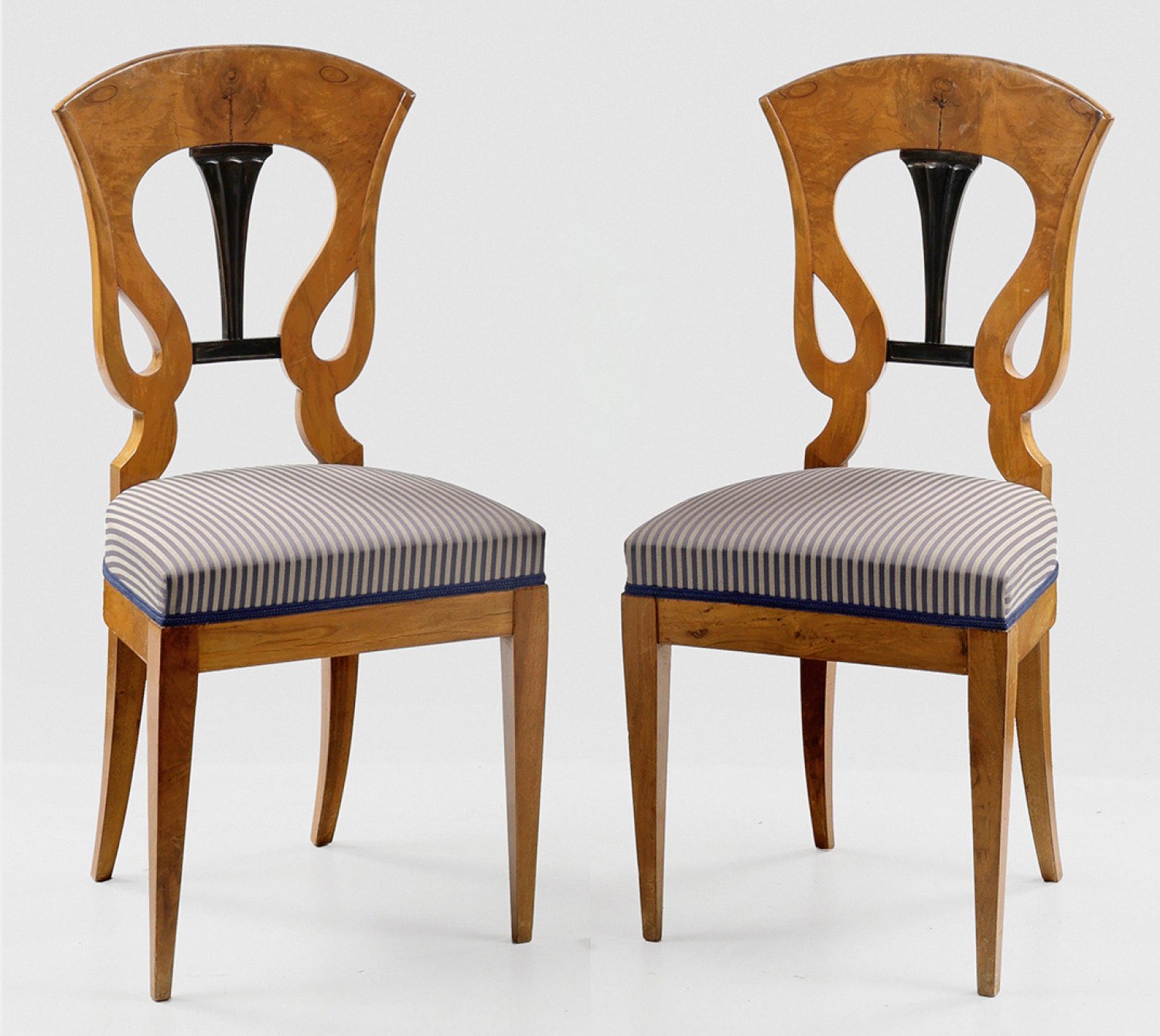 Paar Biedermeier-Stühle Helles Nussbaum, furniert sowie teilw. ebonisiert. Gerade, rückseitig bombierte Zarge auf konischen Vierkantbeinen. Durchbrochen gearbeitete, schildförmige Rückenlehnenrahmung aus Volutenmotiven mit godroniertem Mittelsteg. Sitzfläche gepolstert und bezogen. Sitz-H. 47 cm.