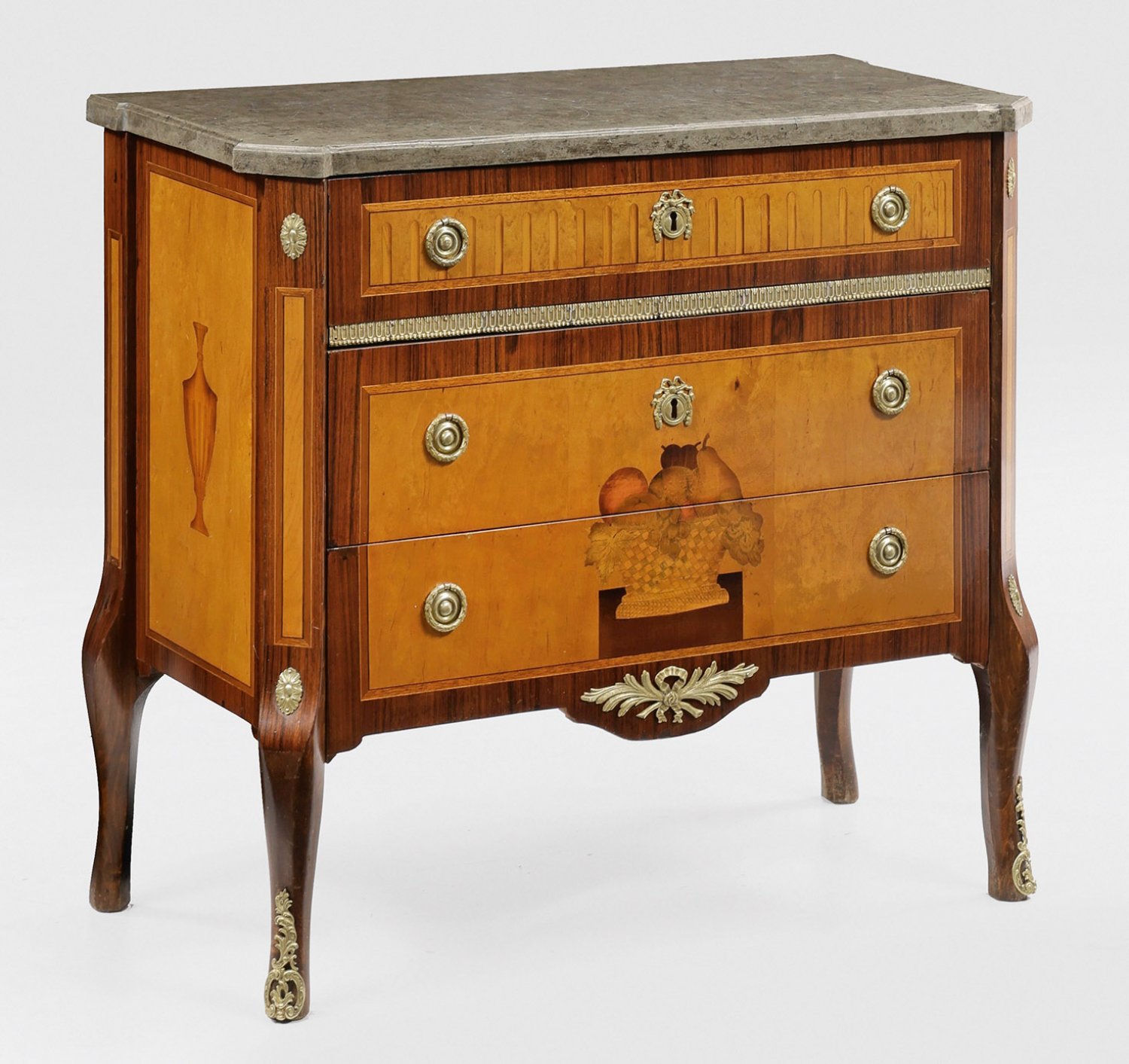 Louis XVI-Kommode Palisander und Ahorn, furniert. Gerader, querrechteckig angelegter Korpus, flankiert von schräggestellten Ecklisenen auf leicht ausgestellten Beinen. In der gegliederten Front drei breite, teilw. optisch verbundene Schubladen unterschiedlicher Größe. Flächendeckend breit gerahmte Furnierfelder mit Vasenmotiven bzw. polychrom gestaltetem Fruchtkorb, durch schmale Einlagen verbunden. Applikationen aus Bronze. Profilierte, an den Ecken verkröpfte Deckplatte aus grauem Marmor. H. 83 cm. 92 cm x 45 cm.
