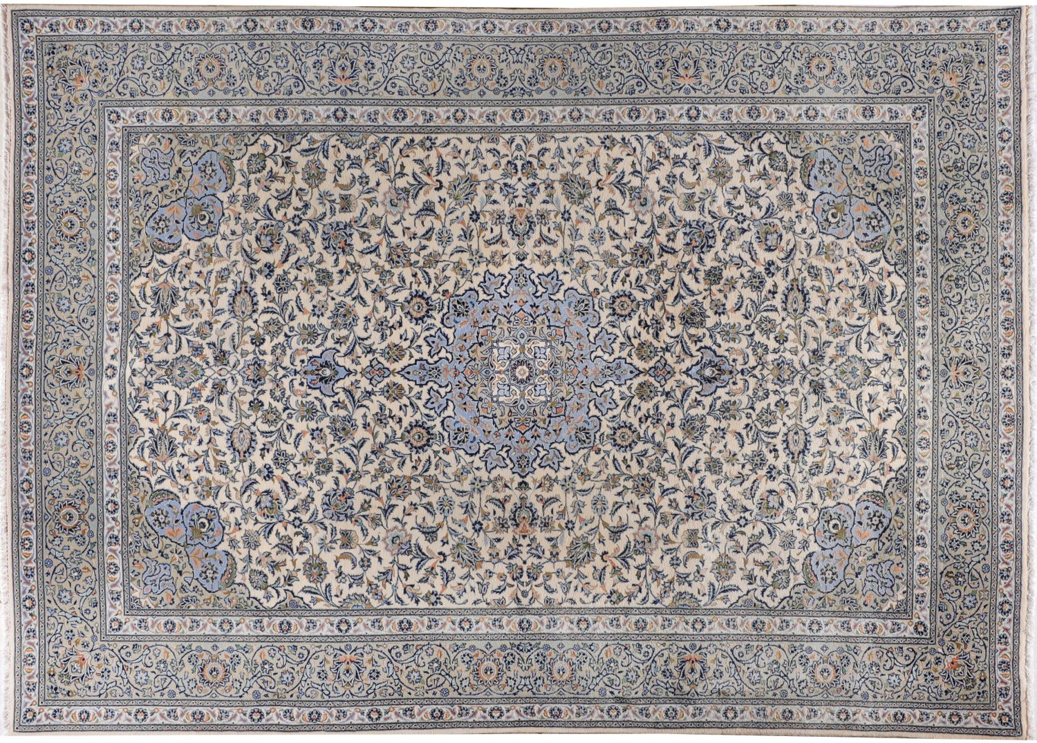 Großer Keschan-Teppich Persien. Wolle auf Baumwolle. Im cremefarbenen Innenfeld großes, hellblaues Zentralmedaillon mit Anhängern sowie korrespondierende Ecklösungen. Flächendeckend dichte Musterung aus Palmettenranken. Umlaufend breite Palmettenbordüre, flankiert von schmalen Nebenbordüren. 360 cm x 250 cm.