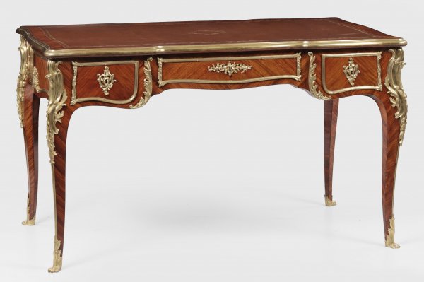 Feines Louis XV-Bureau plat Palisander und Mahagoni, furniert sowie fein gearbeitete Applikationen aus vergoldeter Bronze. Passig geschweifter Korpus auf geschwungenen Beinen mit Tatzenfüßen. In der gegliederten Front breites Kniefach sowie drei Schubladen unterschiedlicher Größe. Rückseitig ausziehbare Abstellfläche. Korrespondierende, profilgerahmte Deckplatte mit eingelegter Arbeitsfläche aus dunkelbraunem, goldgeprägtem Leder. Allseitig profilgerahmte, gespiegelt angeordnete Furnierfelder sowie Applikationen aus Volutenmotiven und Blattwerk. Bronzen rücks. bez. MK. H. 76 cm. 133 cm x 75 cm.