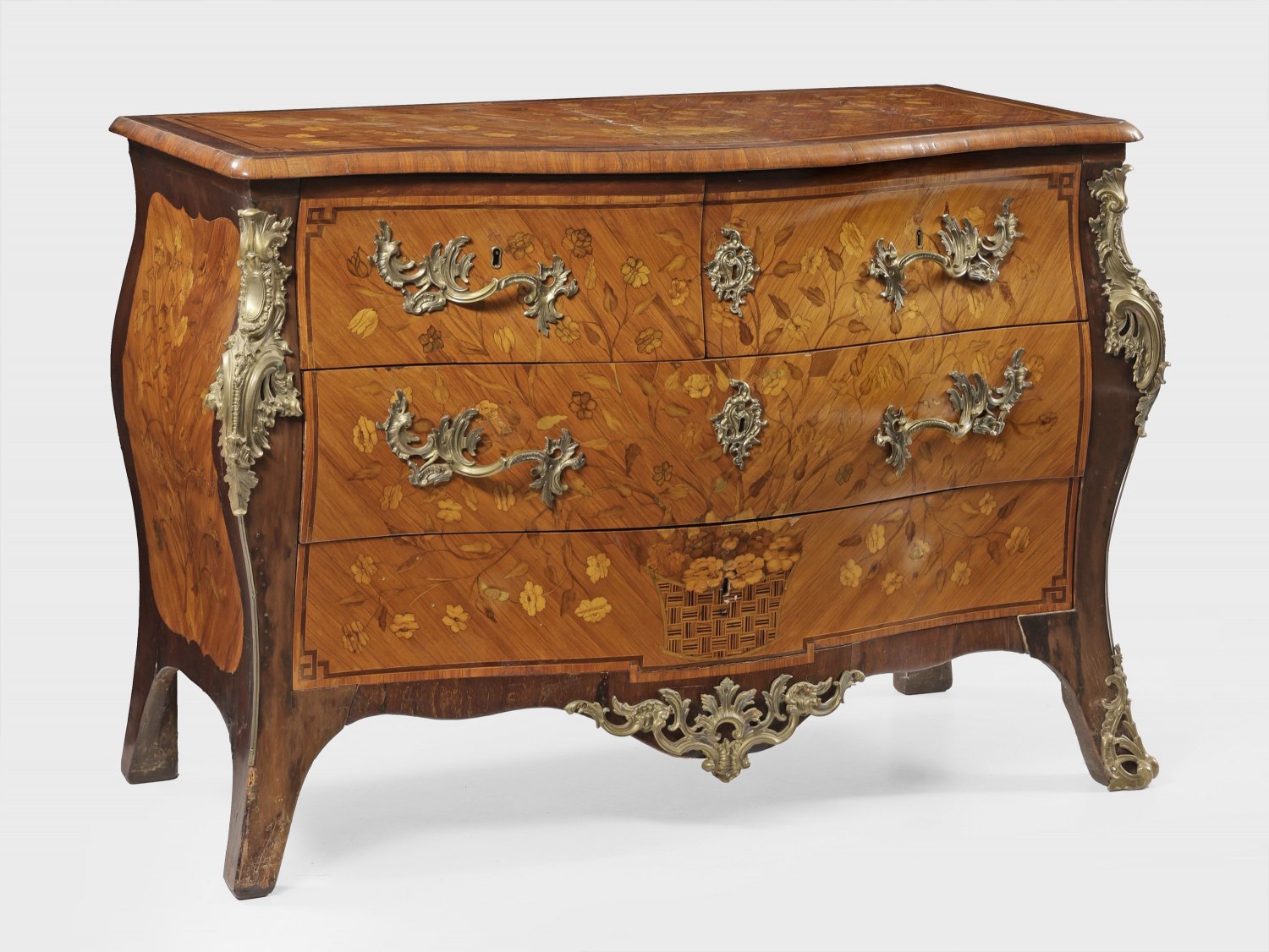 Große signierte Louis XV-Kommode von Jacques Bircklé Rosenholz und Amaranth, furniert sowie reiche Marketerie aus unterschiedlichen, teilw. grün gefärbten Edelhölzern. Dreiseitig bombierter Korpus mit ausgebogter Schürze, flankiert von weit ausgezogenen Ecklisenen, in ausgestellte Beine übergehend. In der gegliederten Front vier optisch verbundene Schubladen unterschiedlicher Größe und sans traverse. Korrespondierende, gering überstehende Deckplatte. Flächendeckend gespiegelt angeordnete Furnierfelder mit großzügig angelegter Marketerie aus blütengefüllten Körben und großen Blütenzweigen, in der Front und auf der Platte von teilw. mäanderförmig verschlungenen Bandeinlagen und feinen Fadeneinlagen begrenzt. Rücks. Schlagstempel Sign. J*BIRCKLE (wird Meister 1764) sowie Pariser Jury Stempel JME. Üppige Applikationen aus Bronze. H. 91,5 cm. 136 cm x 60 cm.
