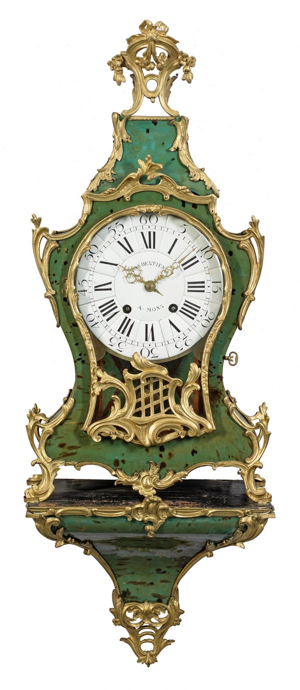 Große Louis XV-Pendule von Nicolas Pierre Séverin Flächendeckender Fond aus seegrün hinterlegtem, lackierten Schildpatt sowie vergoldete Bronze. Balusterförmiger Korpus, umgeben von durchbrochen gearbeiteten Rocaillen mit geschweift ansteigendem oberen Abschluss sowie stark vorkragender, durchbrochen gearbeitete Bekrönung aus Volutenspangen und Blüten. Schlagstempel-Sign. N.P. SEVERIN (wird Meister 1757). Verglastes Zifferblatt aus großen Emailreserven, bez. Vandestine à Mons. Werk mit Fadenaufhängung sowie Halbstundenschlag auf Glocke. Unterhalb korrespondierende Wandkonsole. Ges-H. 110 cm. 40 cm x 23 cm.