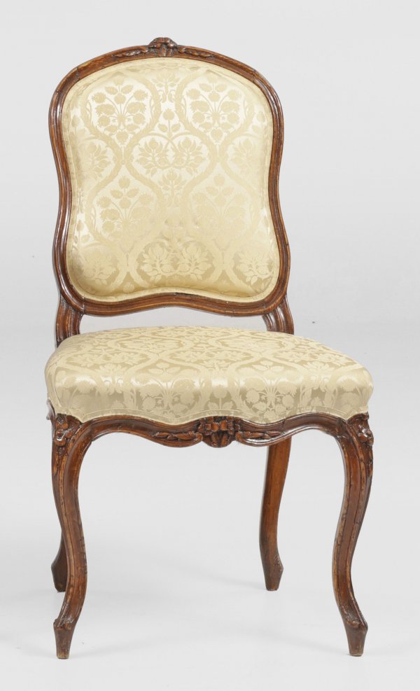 Louis XV-Stuhl Buchenholz, teilw. reliefplastisch geschnitzt und nussbaumfarben gebeizt. Bombierte Zarge mit reliefplastischen Blüten, in geschweifte Beine übergehend. Schildförmige Rückenlehnenrahmung. Allseitig gepolstert und bezogen. Sitz-H. 46 cm.