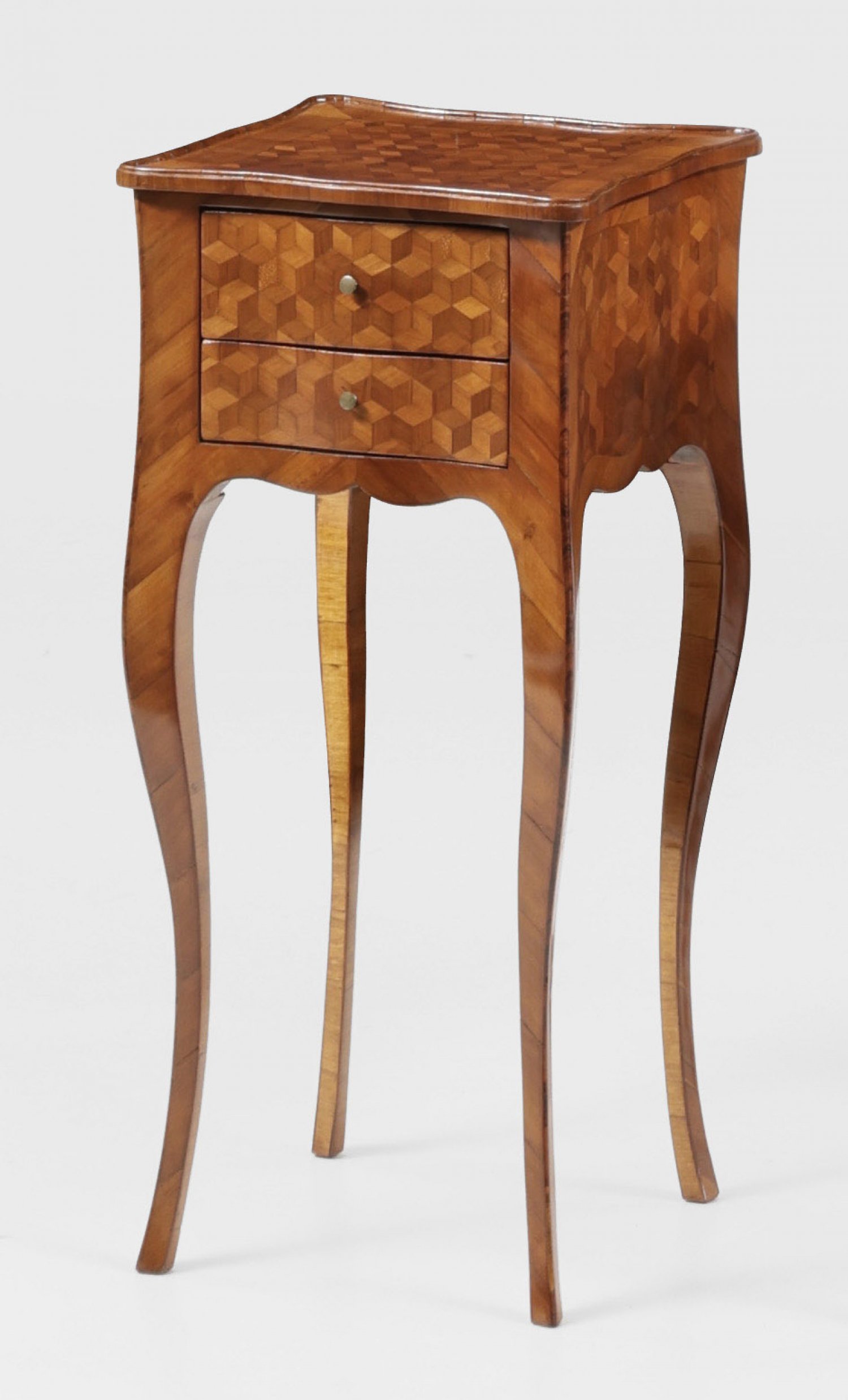 Kleiner Louis XV-Beistelltisch Obstholz, furniert. Bombierter Zargenkasten auf hohen, stark geschwungenen Beinen. In der gegliederten Front zwei Schubladen sans traverse. Gering überstehende, passig geschweifte Deckplatte sowie allseitig breit gerahmte Furnierfelder aus Würfelmarketerie. H. 71 cm 33 cm x 33 cm.