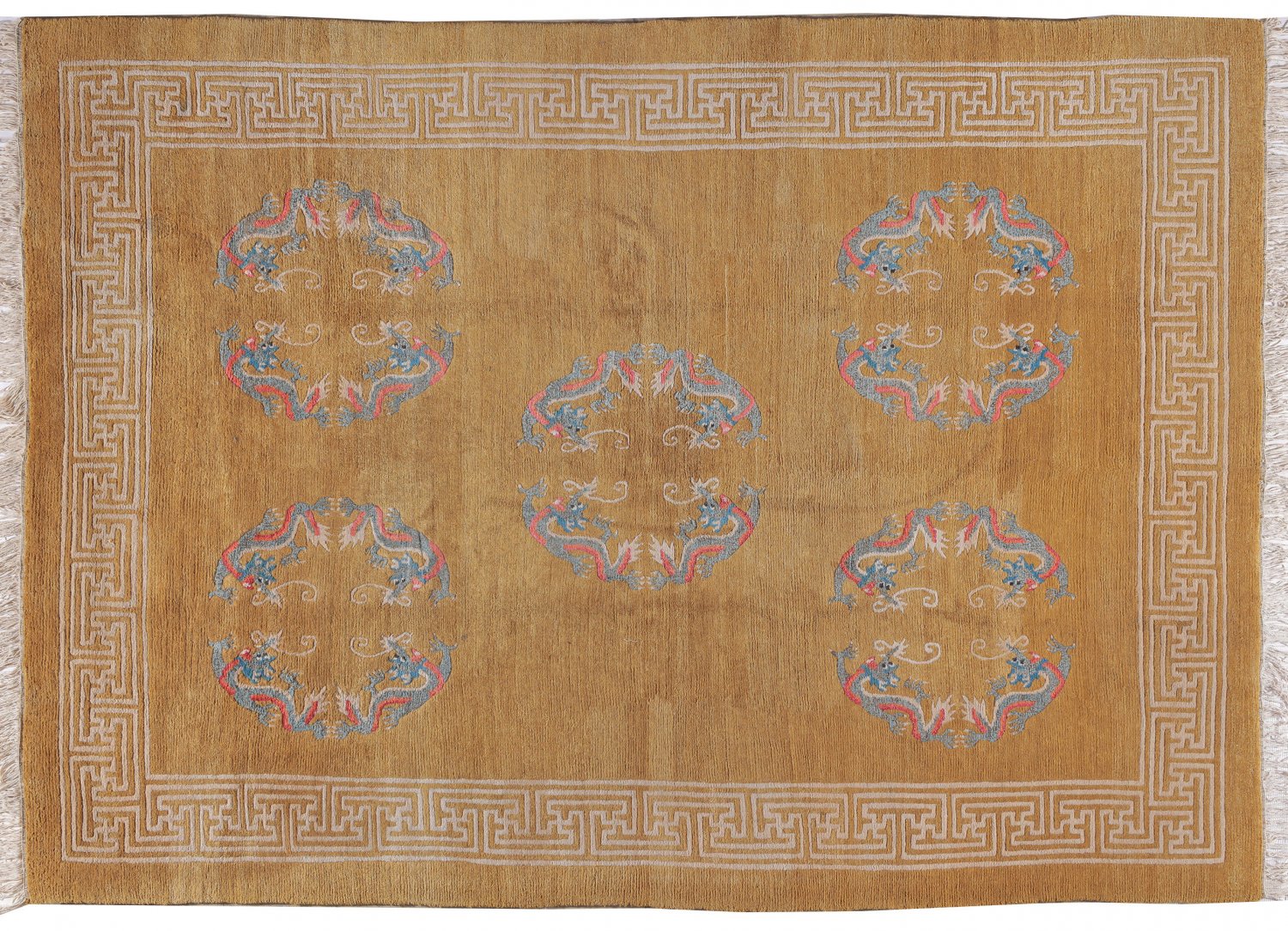 Großer Drachenteppich Tibet. Wolle auf Baumwolle. Auf safranfarbenem Fond fünf Rundmedaillons aus paarweise angeordneten, grau-roten Drachen. Umlaufend breite, beigefarbene Mäanderbordüre. 340 cm x 250 cm.