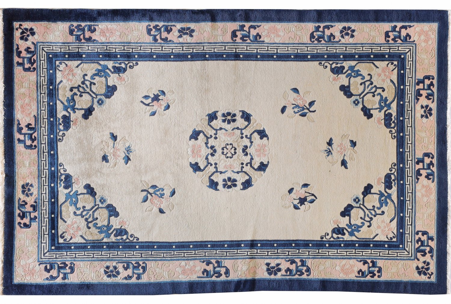 Chinesische Brücke China. Wolle auf Baumwolle. Auf cremefarbenem Fond zentrales Rundmedaillon aus Blüten, umgeben von lose gestreuten Blüten sowie entsprechende arabesk angeordnete Ecklösungen. Umlaufend breite, roséfarbene Bordüre aus Päonien, begleitet von Mäanderband. 203 cm x 130 cm.