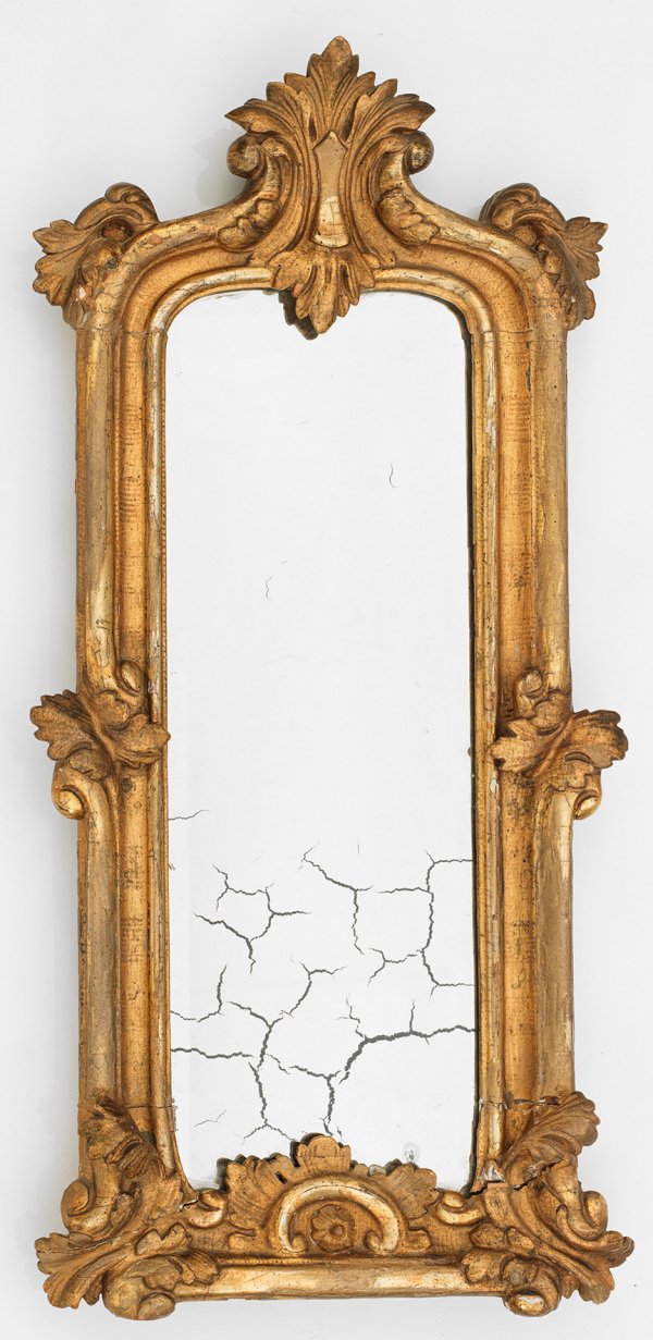 Kleiner Barock-Wandspiegel Holz, geschnitzt, gefasst und vergoldet. Schlanke, hochrechteckige, gekehlte und blattreliefierte Spiegelrahmung mit Bekrönung in Form einer großen Blattkartusche. Rückseitig Etikett Sammlung Heinz Weck. Altersspuren. 61 cm x 29 cm.