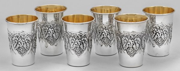 Sechs Weinbecher Silber. Konischer Korpus mit gerundetem Rand. Wandungsmitte reliefplastisch gestaltet in Form von Weinreben. Innen vergoldet. Gest. 925. Gew. zus. ca. 310 g. H. 8 8 cm.