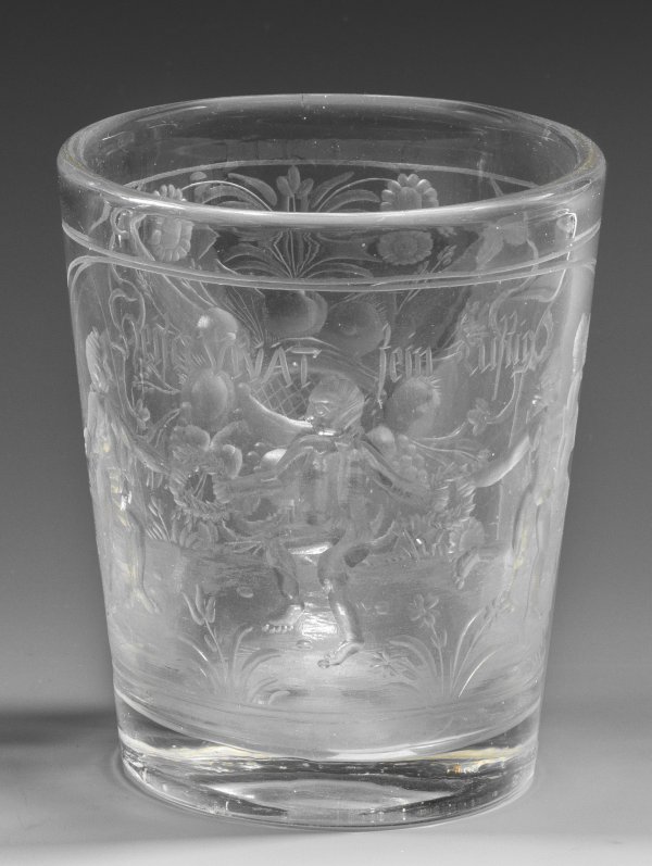 Seltener böhmischer Barock-Becher mit Aktfiguren und Motto Farbloses, dickwandiges Glas. Leicht konische Form. Geblänkter Schnittdekor. Schauseitig ein großes, querovales Bildfeld mit vier weiblichen und männlichen, ausgelassen auf einer Wiese tanzenden und Lorbeerkränze in den Händen haltenden Aktfiguren, oberhalb korrespondierende Inschrift-Devise "Heißa VIVAT sein lustig". Rückseitig ein Früchtefeston. H. 11 cm.