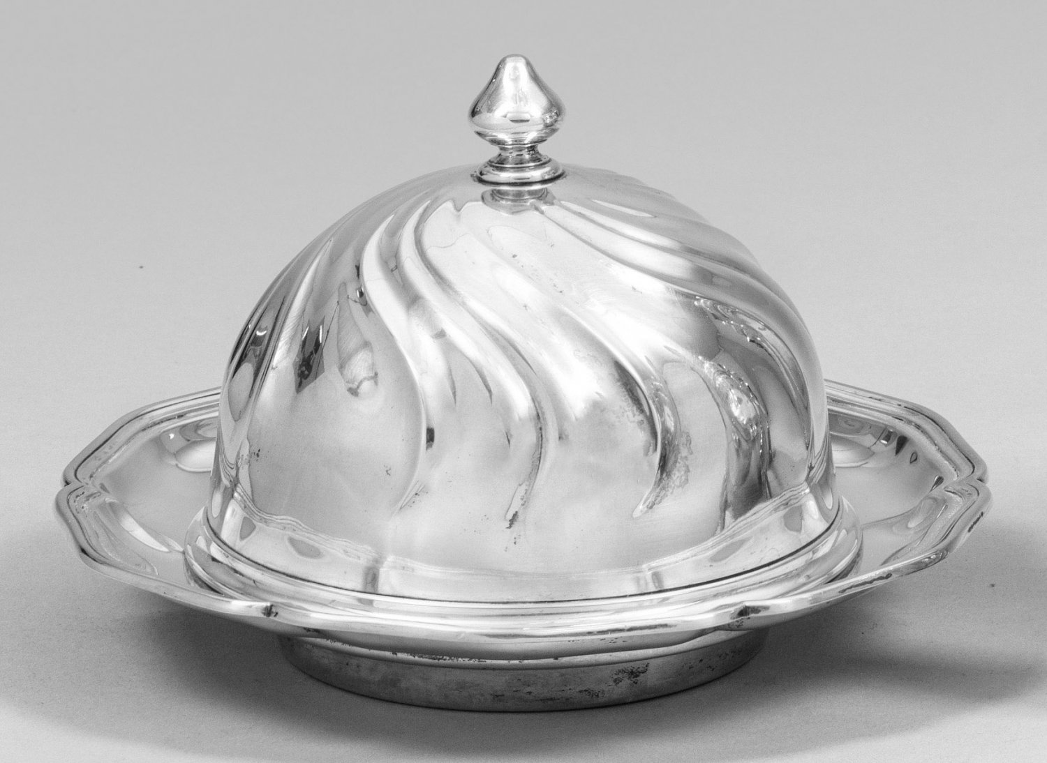 Butterdose Silber. Tief gemuldeter, glatter Spiegel, in breite Fahne übergehend. Blütenförmiger, mehrfach profilierter Rand. Haubenförmiger Deckel mit passig geschweiften Zügen und Balusterknauf. Farbloser Glaseinsatz mit geschliffenem Boden in Form eines Sterns. Glaseinsatz best.; Gest. 800, Herstellerzeichen. Gew. ca. 405 g. H. 11,5 cm. D. 17,8 cm.