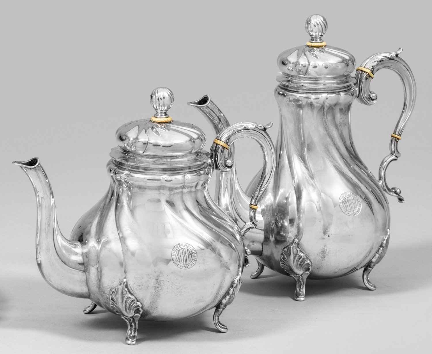 Tee- und Kaffeekanne im Stil des Dresdner Hofmusters Silber. Über vier Rocaillenfüßen birnförmiger, von geschweiften Zügen gegliederter Korpus. Tief angesetzter Ausguss und geschwungener Ohrenhenkel. Gewölbter Scharnierdeckel mit Kugelknauf. Auf der Wandung mit Gravur "Verein für Hinderniss-Rennen 1881". Der Verein für Hindernisrennen, eine Vereinigung mit Mitgliedern des preußischen Hoch- und Landadels, wie z. B. König Wilhelm von Württemberg, die Kronprinzen und Prinzen von Preußen oder die Prinzen von Thurn und Taxis, gründete sich 1881 und war Eigentümer der seit 1894 bestehenden "Galopprennbahn für Hindernis- und Jagdrennen" in Berlin-Karlshorst. Gest. 800, undeutl. Herstellerzeichen, Händlermarke Margraf & Co., Berlin. Gew. zus. ca. 1610 g. H. 20,5 cm - 25 cm.
