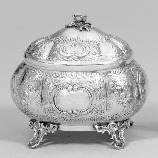 Zuckerdose im Rokokostil Silber. Auf vier Volutenfüßen querovaler, bombierter Korpus mit aufgewölbtem Scharnierdeckel, bekrönt von plastischer Blüte. Wandung und Deckel umzogen von reliefplastischem Voluten- und Rosendekor, gerahmt von Rocaillen. Innen vergoldet. Gest. 925 Sterling, Herstellerzeichen "SK". Gew. ca. 311 g. H. 13,5 cm. 15,5 cm x 12,5 cm.