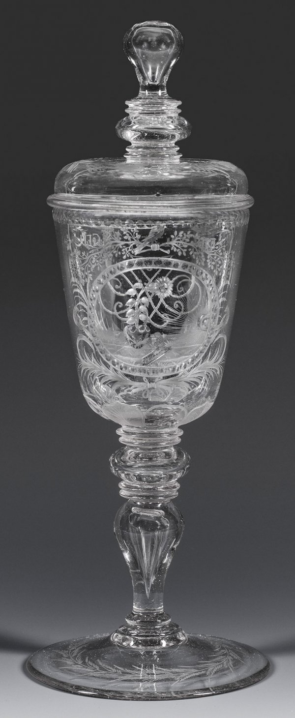 Potsdamer Deckelpokal Farbloses Glas. Auf flachem, mittig ansteigendem Scheibenfuß gegliederter, teilw. hohler Balusterschaft und konische Kuppa. Gewölbter Deckel mit Balusterknauf. Schnitt- und Schliffdekor mit Blankperlen und Oliven. Auf der Kuppa ein emblematisches Ovalmedaillon mit einer aus einem Herzen entspringenden Sonnenblume, die sich der Sonne zuneigt; oberhalb bzw. flankierend Palmwedel und Zweige mit Vögeln. Rücks. Dekor mit korrespondierender Inschrift "DIR WIL(L) ICH FOLGEN" und Spiegelmonogramm (JPS?). Am Kuppaansatz umlaufende Blattbordüre, der Lippenrand mit Blankperlen, der Fuß mit feiner Blattranke, auf dem Deckel umlaufende Blüten- und Blattranke. H. 31 cm.