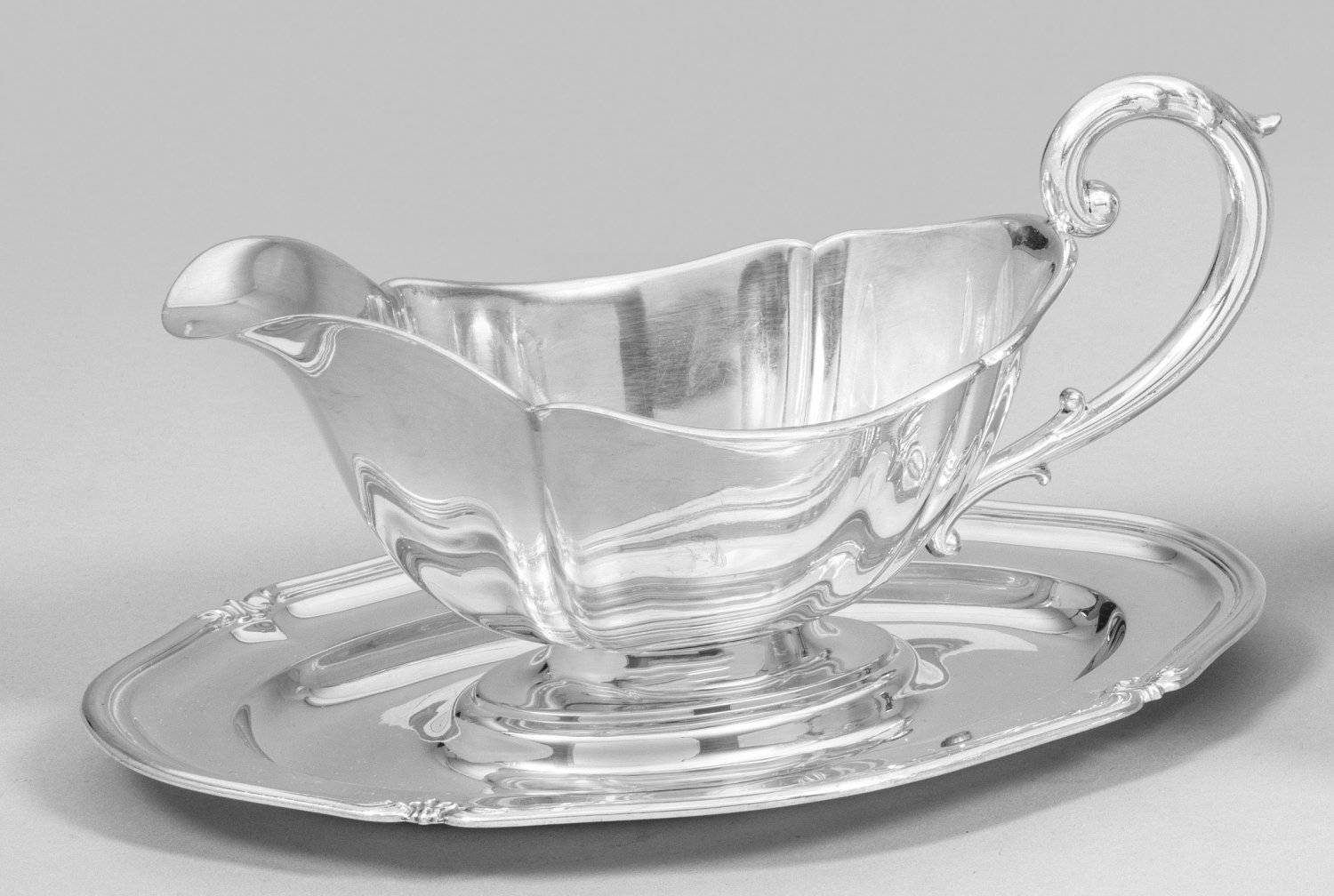 Sauciere im Barockstil Silber. Über ovaler, festmontierter und randprofilierter Unterschale schiffchenförmiger Korpus mit breitem Ausguss und volutenförmigem Ohrenhenkel. Die glatte Wandung durch passig geschweifte Züge gegliedert. Unterschale mit graviertem Monogramm "V". Gest. 830, Herstellerzeichen. Gew. ca. 457 g. H. 12,3 cm.