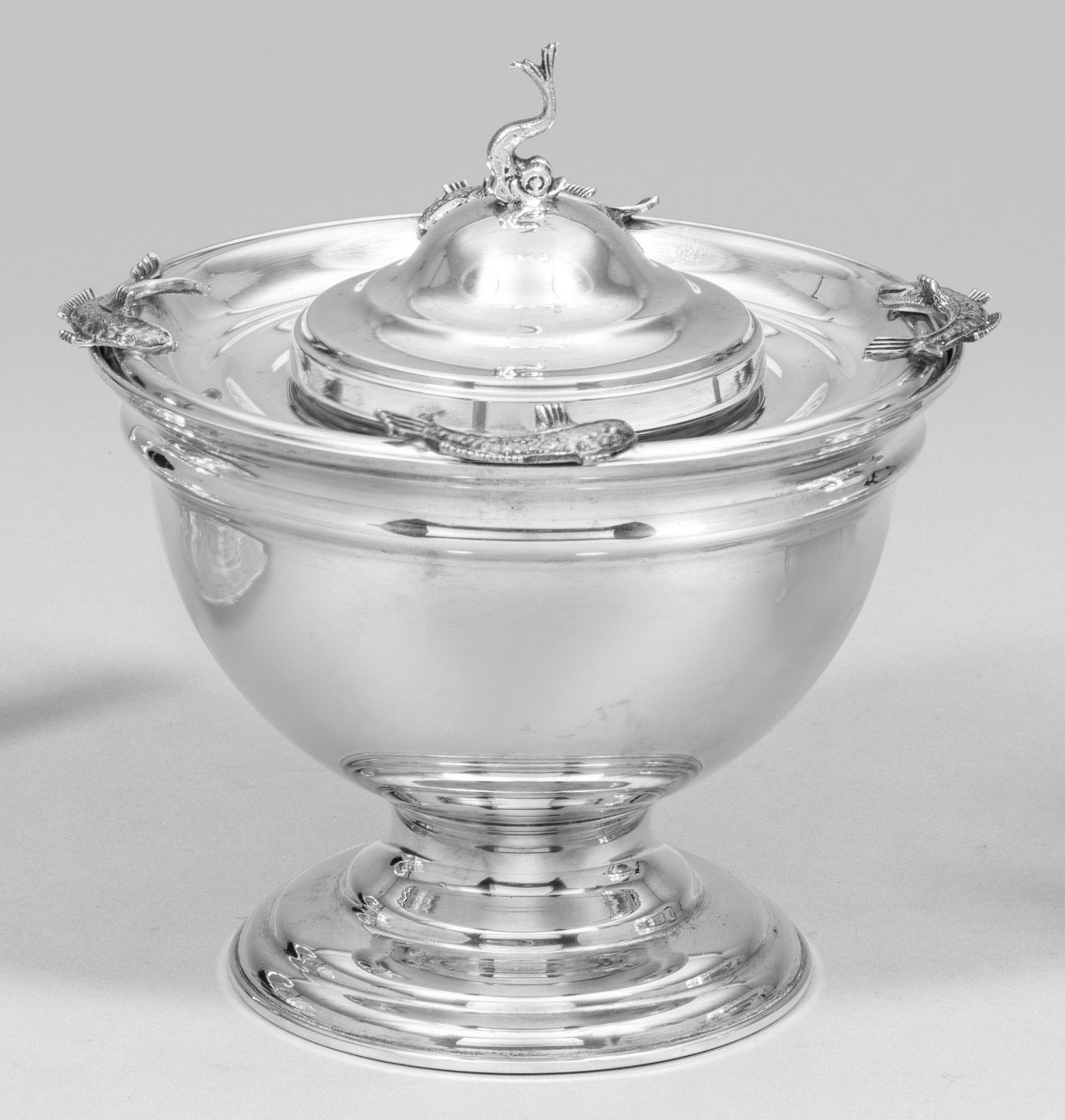 Kaviar-Deckelschale Silber. Über getrepptem Stand halbrunder Korpus mit glatter Wandung. Einsatz mit vier plastisch gearbeiteten Fischen mittig farbloser Glaseinsatz. Glockenförmiger Deckel mit Delphinknauf. Gest. 800. Gew. ca. 670 g. H. 18 5 cm.