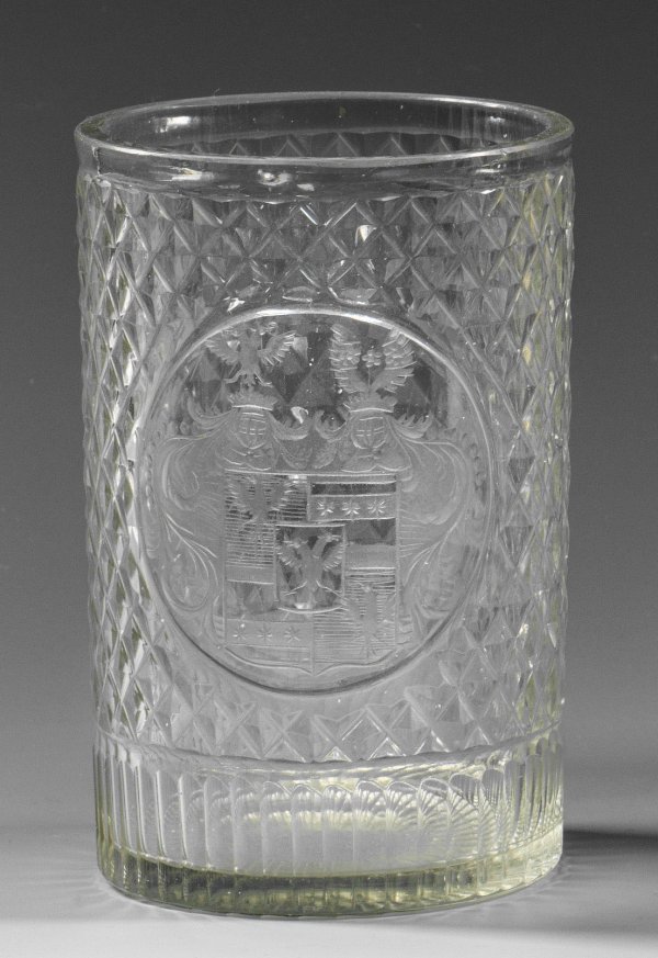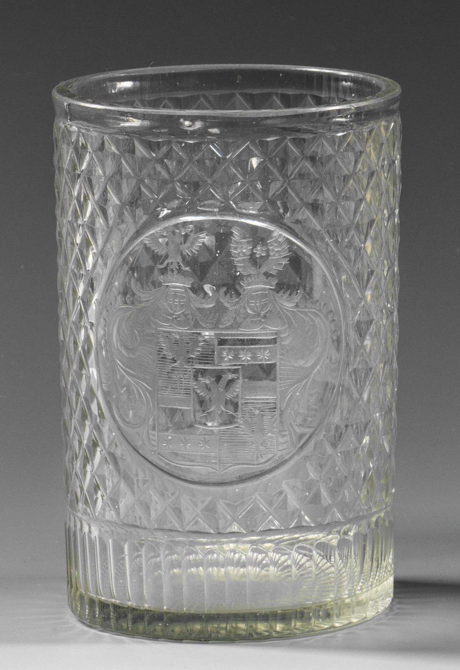 Empire-Wappenbecher Farbloses Glas geschliffen. Zylindrische Form. Gesteinelte Wandung unterhalb umlaufendes Keilschlifffriesband. Schauseitig ein Rundmedaillon mit fein geschnittenem partiell geblänktem Allianzwappen. H. 11 5 cm.