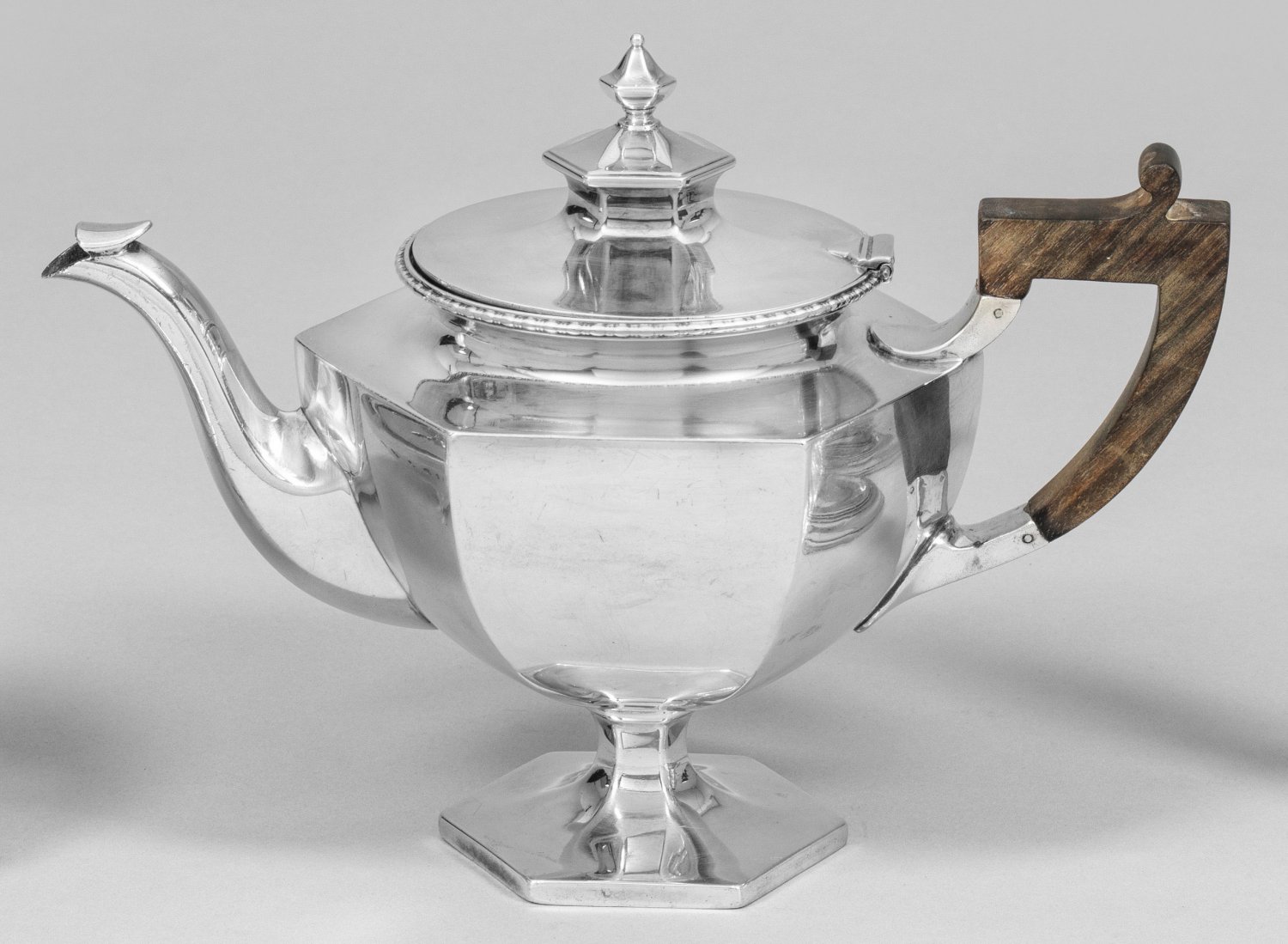 Georgianische Teekanne Silber. Über sechsfach gekantetem flachem Stand kurzer eingezogener Schaft übergehend in sechsfach facettierten Korpus mit gerader glatter Schulter und rundem Scharnierdeckel. Auf dem Deckel ein ebenfalls gekanteter Balusterknauf. Tief angesetzter Ausguss und kantiger Holzgriff. Gest. Sterling Herstellerzeichen. Gew. ca. 783 g. H. 19cm.