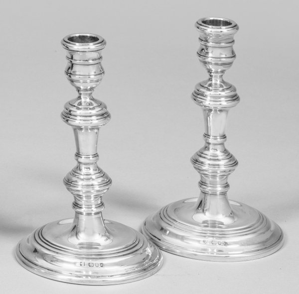 Paar Tafelleuchter im Barockstil Silber. Über mittig gemuldetem Rundfuß ein hoher durch mehrfach gedrückte Nodi gegliederter Balusterschaft mit vasenförmiger Tülle. Gest. 925 Beschaumarken Herstellerzeichen. Gew. zus. ca. 490 g. H. 16 5 cm.
