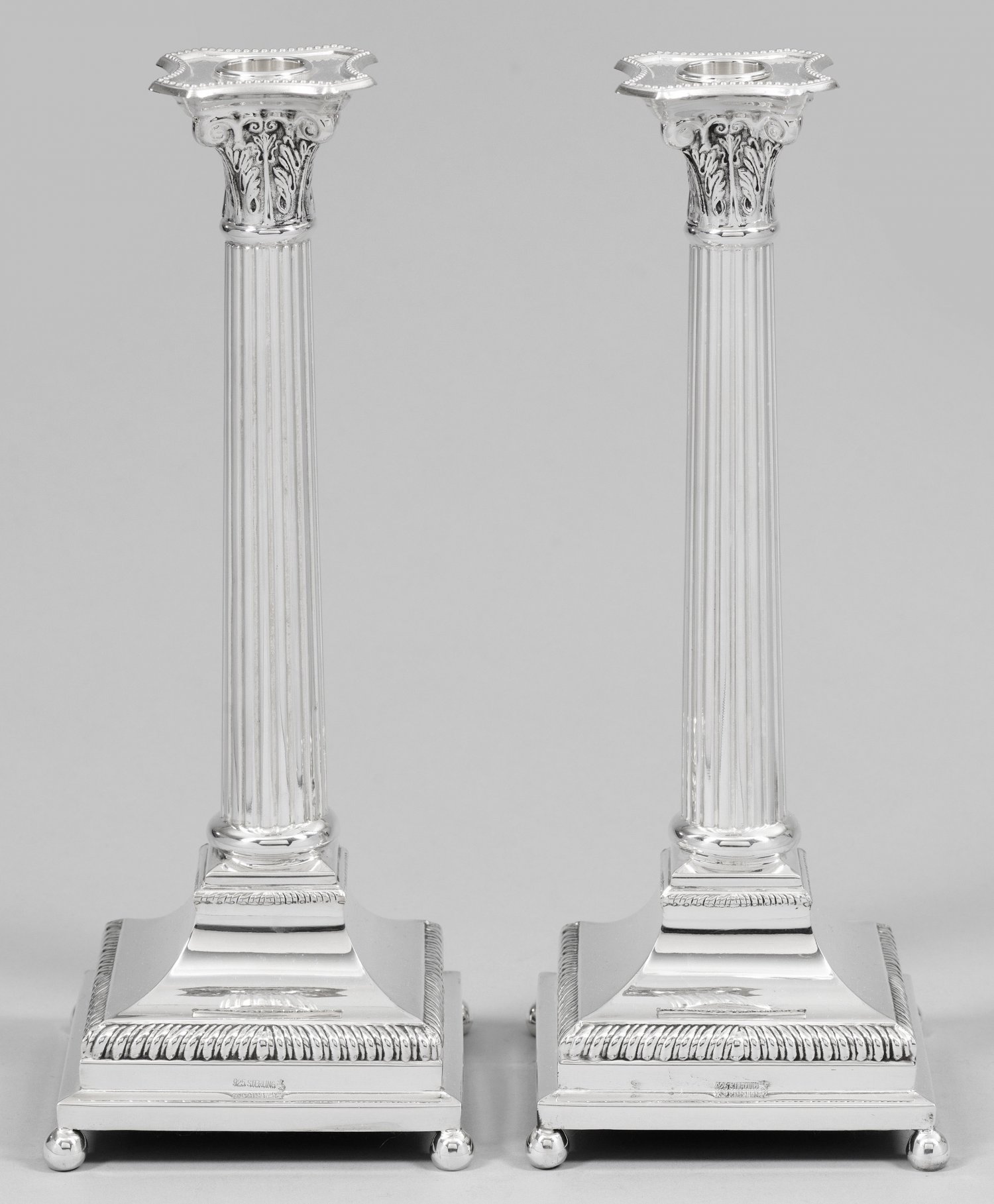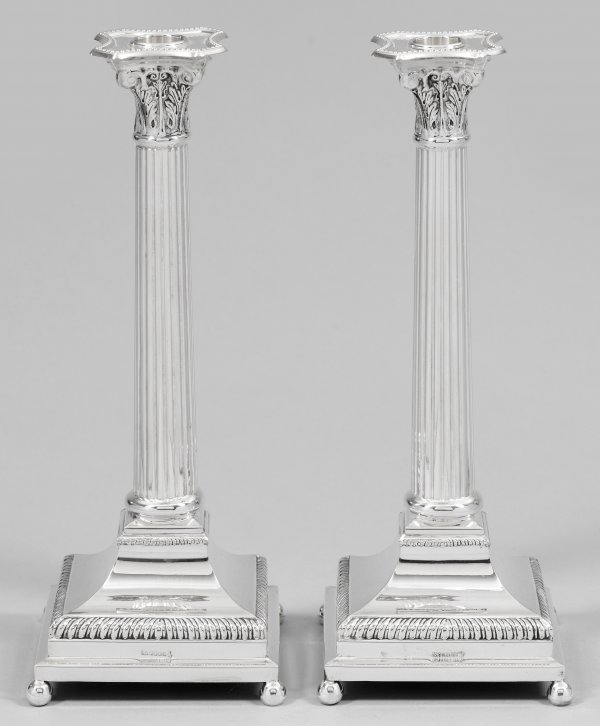 Paar große Tafelleuchter im Empirestil. Silber. Getreppter Stand beschwert. Hoher kannelierter Schaft in reliefiertem Akanthuskapitell endend. Gest. 925. H. 31 cm.