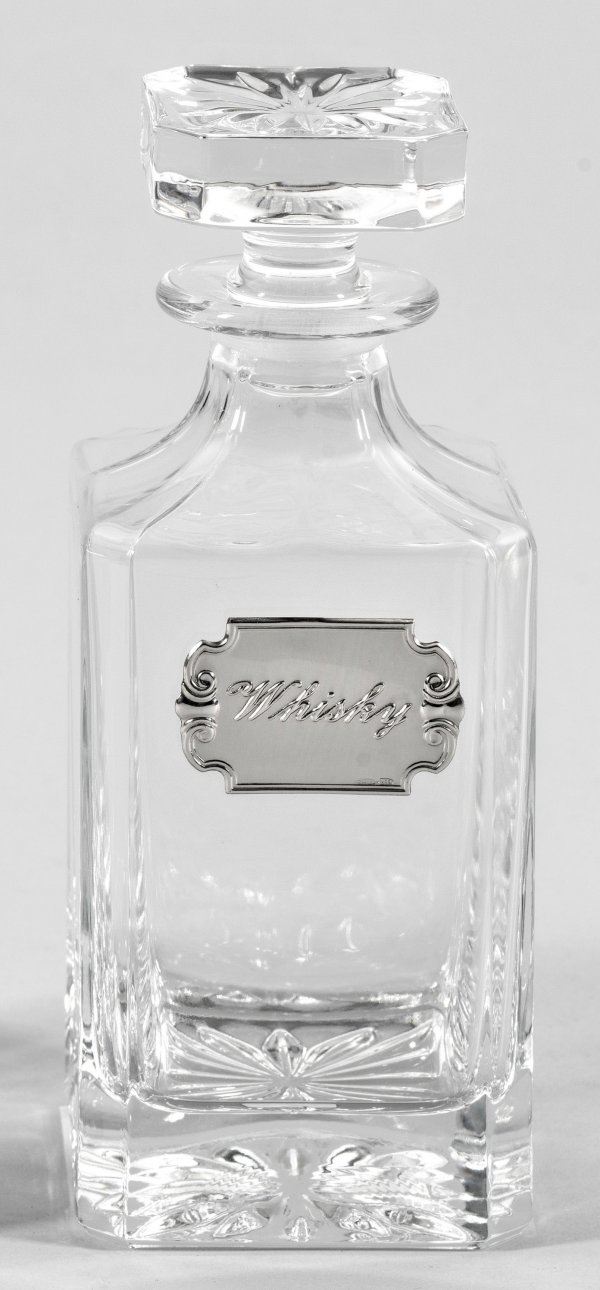 Whisky-Karaffe mit Stöpsel Farbloses Kristallglas, in die Form geblasen. Quadratisch, abgeschrägte Ecken. Schauseitig montierte Silber-Plakette mit reliefierter Bez. "Whisky". Gest. 925. H. 22,5 cm.