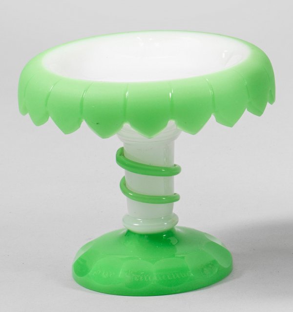 Tazza mit Schlangenauflage Weißes, mit hellgrün eingefärbtes Alabasterglas (Chrysoprasglas). Der geschälte Fuß mit geschnittener Inschrift "Zur Erinnerung 1851", am Säulenschaft eine spiralförmig aufgelegte Schlange, der nach unten ausgezogene Rand bogen- bzw. zungenförmig geschliffen und mattiert. Minim. best.; H. 15 cm.