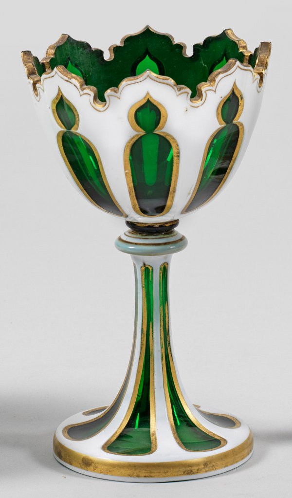 Spätbiedermeier-Pokal Grünes Glas weißer Zinnemailüberfang. Trompetenförmiger in den hohlen Schaft einschwingender Fuß ovoide Kuppe mit geschweiftem Rand. Goldkonturierter ornamentaler Schliffdekor. H. 25 2 cm.