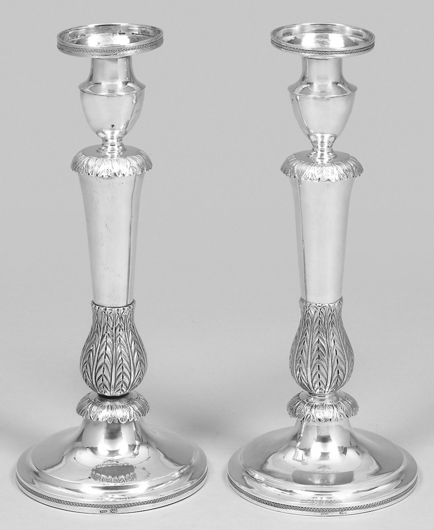 Paar große Biedermeier-Tafelleuchter Silber. Trompetenförmiger von graviertem Eierstabfries umzogener Stand beschwert. Mit reliefplastisch gestalteten Lanzettblättern umzogener Nodus übergehend in glatten Balusterschaft. An der Schulter ein ausschwingender reliefierter Blätterkranz. Darüber eine vasenförmige Tülle mit herausnehmbarer dem Stand entsprechend verzierter Traufschale. Gest. 13 Lot Meister Wilhelm Conrad Hessenberg (wird Meister 1799). Gew. zus. ca. 1355 g. H. 28 5 cm.