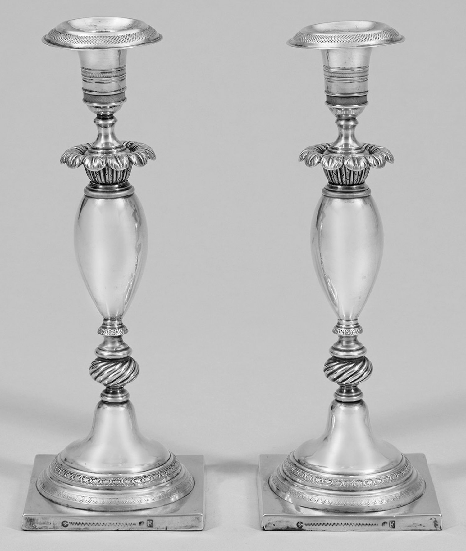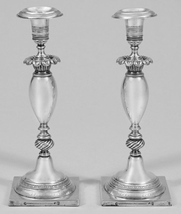 Paar Biedermeier-Tafelleuchter Silber. Quadratische Plinthe beschwert. Trompetenförmiger von schmalen guillochierten Friesen umzogener Stand übergehend in hohen Balusterschaft. Vasenförmige Tülle mit herausnehmbarer Traufschale. Wenige altersgemäße Gebrauchsspuren. Gest. Tremolierstrich Stadtmarke Beschaumeister Meister George Friedrich Fournier (wird Meister 1805). Gew. zus. ca. 865 g. H. 24 cm.